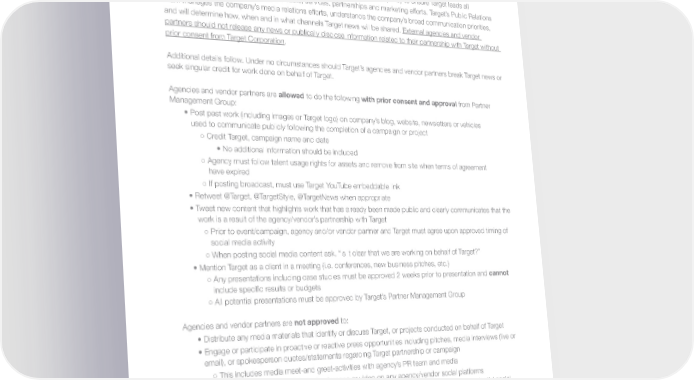Target Usage Guidelines Vendor Announcement Guidelines External Agency and Vendor Communications Policy: Target asks its agencies and vendors to adhere to a strict communications policy to ensure Target leads all communication about its business, products, services, partnerships and marketing efforts. Target’s Public Relations team manages the company’s media relations efforts, understands the company’s broad communication priorities, and will determine how, when and in what channels Target news will be shared. External agencies and vendor partners should not release any news or publically disclose information related to their partnership with Target without prior consent from Target Corporation. Additional details follow. Under no circumstances should Target’s agencies and vendor partners break Target news or seek singular credit for work done on behalf of Target. Agencies and vendor partners are allowed to do the following with prior consent and approval from Partner Management Group: • Post past work (including images or Target logo) on company’s blog, website, newsletters or vehicles used to communicate publicly following the completion of a campaign or project ○ Credit Target, campaign name and date • No additional information should be included ○ Agency must follow talent usage rights for assets and remove from site when terms of agreement have expired ○ If posting broadcast, must use Target YouTube embeddable link • Retweet @Target, @TargetStyle, @TargetNews when appropriate • Tweet new content that highlights work that has already been made public and clearly communicates that the work is a result of the agency/vendor’s partnership with Target ○ Prior to event/campaign, agency and/or vendor partner and Target must agree upon approved timing of social media activity ○ When posting social media content ask, “is it clear that we are working on behalf of Target?” • Mention Target as a client in a meeting (i.e. conferences, new business pitches, etc.) ○ Any presentations including case studies must be approved 2 weeks prior to presentation and cannot include specific results or budgets ○ All potential presentations must be approved by Target’s Partner Management Group Agencies and vendor partners are not approved to: • Distribute any media materials that identify or discuss Target, or projects conducted on behalf of Target • Engage or participate in proactive or reactive press opportunities including pitches, media interviews (live or email), or spokesperson quotes/statements regarding Target partnership or campaign ○ This includes media meet-and greet-activities with agency’s PR team and media • Tweet or post new content including images or video on any agency/vendor social platforms (campaign, behind-the-scenes on set, event space). Please see above for pre-approved potential social media opportunities. All exception requests should be submitted through the external partner’s Target contact. 10