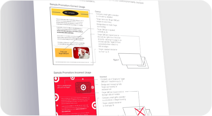 Target Usage Guidelines Delivery Tips Delivery Tips: When presenting Target GiftCards to recipients, keep the look and feel of your delivery mechanism (Target GiftCard carrier) consistent with your company’s brand standards. The carrier should be letter-sized and bifolded for easy delivery (see Figure 1). The Target GiftCard should be positioned on the bottom right side of your letter. This will help to avoid brand confusion, ensuring that your brand is prominently displayed. Always be mindful of your own brand standards. Sample Promotion: Correct Usage Correct ABC Company · Company creating the promotion is prominently identified · Target name and Target GiftCard Thank you for being a loyal customer to ABC Company. Refer your friends and image are secondary family to our services and, as a token of our appreciation, we will send you a · Design does not imply Target $25 Target GiftCard every time a new referral signs up. That’s not all—your friends and family will also receive a $10 Target GiftCard when they sign up. sponsorship Si meliora dies ut vina poemata reddit, scire velim chartis pretium quotus · Target GiftCard is spelled arroget annus. Scriptor abhinc annos centum qui decidit, inter perfectos correctly (p. 6) · Target GiftCard is positioned at Quid, qui deperiit minor uno mense vel anno, inter quos referendus erit. the bottom right side of the letter Veteresne poetas, an quos et praesens et postera respuat aetas. Iste quidem (8.5x11)—allowing the page to be veteres inter ponetur honeste, qui vel mense brevi vel toto est iunior anno. bifolded and the Target GiftCard Utor permisso, caudaeque pilos ut equinae paulatim vello unum, demo etiam concealed when mailed in a unum, dum cadat elusus ratione ruentis acervi, qui redit in fastos et virtutem #10 envelope · Target standard disclaimer Enjoy your is shown (p. 8) Target GiftCard! Figure 1 Target and the Bullseye Design are registered trademarks of Target Brands, Inc. Terms and conditions are applied to gift cards. Target is not a participating partner in or sponser of this offer. Sample Promotion: Incorrect Usage Incorrect · Incorrect use of Target and Target GiftCard in headline copy (p. 7) Here’s a complimentary · Design and messaging imply gift card from Target! Target sponsorship or endorsement · Target GiftCard is positioned at top right side of the letter Thank you for being a loyal customer to ABC Company. Refer your friends and family to · Company creating the promotion our services, and as a token of our appreciation, we will send you a $25 Target GiftCard every time a new referral signs up. That’s not all—your friends and family will also is subordinate to Target branding receive a $10 Target GiftCard when they sign up. Si meliora dies ut vina poemata reddit, scire velim chartis pretium quotus arroget · Target standard disclaimer annus. Scriptor abhinc annos centum qui decidit, inter perfectos veteresque referri is missing (p. 8) debet an inter vilis atque novos. Excludat iur robus, Quid, qui deperiit minor uno mense vel anno, inter quos referendus erit. Veteresne poetas, an quos et praesens et postera respuat aetas. Iste quidem veteres inter ponetur honeste, qui vel mense brevi vel toto est iunior anno. Figure 2 ABC Company 12
