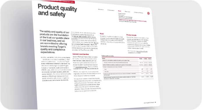 0 Products and Guest Experiences Built on Fairness and Equity Introduction Environmental Social Governance Indexes and Glossary Social Overview Product quality and safety Inside Social Supporting Our Team Members Board and Workplace Diversity Products and Guest Experiences Built on Fairness and Equity Serving and Strengthening Communities The safety and quality of our products are the foundation of the trust our guests place in our business, and we are committed to offering brands meeting Target’s quality and compliance expectations. By 2025, we plan for 100% of our owned brands — in addition to our owned brand limited-edition and brand partnerships — to adhere to Target’s already established sustainability standards. Key enablers for overall progress toward this goal include our food safety, quality and regulatory (FSQR) teams, which oversee food and essentials. All products must meet regulatory, safety and quality standards. Our product safety and quality assurance (PSQA) team manages non-food quality and safety, with a focus on regulatory compliance and performance requirements. As a company, we are active members of the Retail Industry Leaders Association (RILA) , the National Retail Federation (NRF) , The Toy Association and other product-specific groups for non-food products, while food compliance team members have membership of the National Environmental Health Association (NEHA) , the Food Industry Association (FMI), the Consumer Brands Association (CBA) and the International Association for Food Protection (IAFP). General merchandise Target’s PSQA team helps protect our guests by requiring that our owned brand products meet mandatory safety standards, and we frequently require owned brand vendors to exceed regulatory requirements and support our responsible sourcing efforts by validating compliance to our Restricted Substances List. PSQA is also responsible for ensuring federal regulatory compliance of national brand products where Target is the importer of record. We expect our vendors of owned and national brand products to comply with our manufacturing and quality processes. Our product safety and quality program is incorporated at every stage of the product life cycle of our owned brand products. These products must pass all testing before they are approved for shipment. Food Product recalls We monitor the safety and quality of our food products through holistic food safety and quality management, from auditing vendor factories and fields to inspecting our supply chain facilities and stores. When we learn about a concern with one of our products, we investigate and, when necessary, remove it from sale. If a product is recalled, our processes require the in-store and online product to be locked and not to be sold. Multiple communication methods are in place to directly contact consumers about a recall. Read more about food, safety, quality and compliance on our website. Product quality and safety Metric FY2021 FY2020 FY2019 Number of vendor factories (countries) producing owned brand foods Number of Global Food Safety Initiative-certified food factories 980 (29) 925 (27) 821 (23) Number of factories (countries) producing owned brand non-food products 1,704 (30) 1,601 (37) 1,990 (35) Number of factory evaluations Target conducted Food 1,487 1,505 1,201 Non-food 1,480 758 1,649 Number of product test reports for owned brand products conducted by independent third-party labs 31,627 29,750 32,633 Number of product inspections of owned brand products conducted by Target team members and independent third parties 33,527 40,093 43,899 2022 Target ESG Report 43