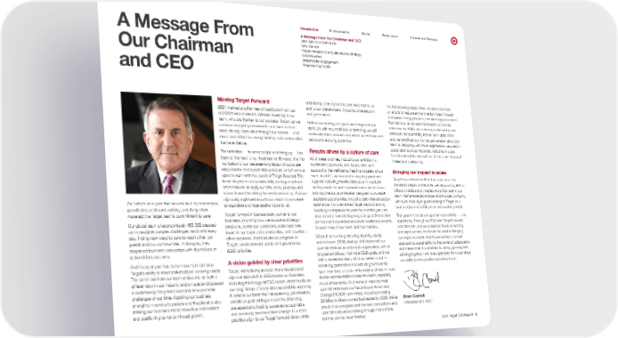 0 Introduction Environmental Social Governance Indexes and Glossary A Message From Our Chairman and CEO A Message From Our Chairman and CEO Q&A With Our SVP of CR Who We Are Target Forward: Our Sustainability Strategy ESG Priorities As I reflect on a year that was marked by tremendous growth and continued volatility, one thing never wavered: the Target team’s commitment to care. Our global team of approximately 450,000 stepped up to navigate complex challenges, each and every day, finding new ways to care for each other, our guests and our communities. In doing so, they deepened trust and connection with the millions of stakeholders we serve. And the past year has done more than reinforce Target’s ability to meet stakeholders’ evolving needs. The care I see from our team strikes me as both a differentiator in our industry and an outstanding asset in addressing the great social and environmental challenges of our time. Applying our business strengths in service to people and the planet is also making our business more innovative and resilient and positioning us for continued growth. Moving Target Forward 2021 marked another year of rapid growth on top of 2020’s record results. We kept investing in our team, who are the key to our success. Today, as we continue navigating headwinds, our team is even more closely connected through our culture — and more committed to serving families and communities than ever before. That ambition — to serve people and bring joy — has been at the heart of our business for 60 years. It is the foundation of our decades-long legacy of corporate responsibility and sustainable practices, which we built upon in 2021 with the launch of Target Forward. This latest chapter in our sustainability strategy redefined what it means to apply our size, scale, purpose and values toward benefiting the world around us. And we rigorously organized around our vision: to co-create an equitable and regenerative future for all. Target Forward influences every corner of our business, informing how we source and design products, power our operations, select partners, invest in our team and communities, and countless other decisions. And it advances progress on Target’s environmental, social and governance (ESG) priorities. A vision guided by clear priorities Today, we’re taking an even more focused and rigorous approach to ESG across our business, including this inaugural ESG report, which builds on our long history of corporate responsibility reporting. It reflects our belief that transparency, prioritization, ambitious goal-setting and continual learning are essential to holding ourselves accountable and achieving transformative change. Our ESG priorities align to our Target Forward vision, while Stakeholder Engagement Progress Highlights addressing other topics that are important to us and to our stakeholders, including cybersecurity and governance. Neither our strategy nor goals are designed to be static. As with any ambitious undertaking, we will continually listen, evaluate and adjust as we learn and respond to evolving dynamics. Results driven by a culture of care All of these priorities, including our ambition to accelerate opportunity and equity, start with supporting the well-being, health and safety of our team. In 2021, we invested in ongoing pandemic support, including frontline bonuses; an evolved staffing model meant to provide more stable hours and paychecks; and benefits designed to increase equitable opportunities, including debt-free education assistance. Fortune ranked Target second among best large companies to work for, and this year, we announced a new starting wage range of $15 to $24 per hour and expanded access to healthcare benefits to even more of our team and their families. We built on our long-standing diversity, equity and inclusion (DE&I) strategy and deepened our commitments as an anti-racist organization. We’ve long set ambitious, multi-year DE&I goals, and we met or exceeded nearly all of our latest round — increasing promotions and reducing turnover for team members of color, while making strides in more diverse representation across the team, especially in our officer ranks. And we’re on-track to meet commitments from our Racial Equity Action and Change (REACH) committee, including investing $2 billion in Black-owned businesses by 2025. We’re proud of our progress and the new connections and commitments we’re making through these efforts, but this work is never finished. As the following pages show, we also advanced on efforts to reduce environmental impact through renewable energy projects, circular design and more. For instance, as we work to become a net zero enterprise by 2040, we’re driving sustainability and emissions accountability across our supply chain, and we retrofitted our first net zero energy store. Our team is designing with more regenerative, recycled or sustainably sourced materials, including in guest- favorite owned brands such as Cat & Jack, Universal Thread and Everspring. Bringing our impact to scale Target has entered our third fiscal year since the pandemic began. In that time, we’ve grown by tens of billions of dollars and invested more than ever in our team. We’ve emerged a larger and stronger company, with even more loyal guests turning to Target as a source of joy and stability in an ever-evolving world. That growth translates to greater responsibility — and opportunity. Through our ESG and Target Forward commitments, and our perpetual focus on learning and improvement, we remain focused on bringing our impact to scale. And as we connect our bold approach to sustainability to the power of collaboration and a team that is committed to caring, growing and winning together, I am more optimistic than ever about our ability to drive positive outcomes for all. Brian Cornell Chairman and CEO 2022 Target ESG Report 3