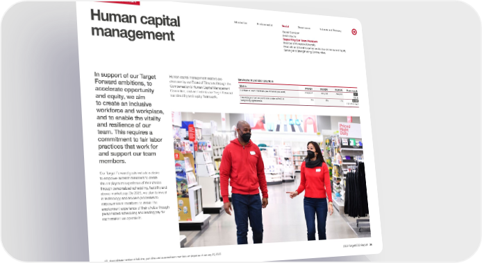 0 - Supporting Our Team Members Introduction Environmental Social Governance Indexes and Glossary Social Overview Human capital management Inside Social Supporting Our Team Members Board and Workplace Diversity Products and Guest Experiences Built on Fairness and Equity Serving and Strengthening Communities Human capital management matters are overseen by our Board of Directors through the Compensation & Human Capital Management Committee, and are tied into our Target Forward sustainability and equity framework. Employment and labor practices In support of our Target Forward ambitions, to accelerate opportunity and equity, we aim to create an inclusive workforce and workplace, and to enable the vitality and resilience of our team. This requires a commitment to fair labor practices that work for and support our team members. Metric FY2021 FY2020 FY2019 Framework Number of team members (as of fiscal year-end) 450,000 49 409,000 368,000 GRI 102-8 Percentage of active workforce under collective bargaining agreements 0% 0% 0% SASB FB-FR-310a.2 Our Target Forward goals include a desire to empower all team members to create the employment experience of their choice through personalized scheduling, flexibility and above-market pay. By 2025, we plan to invest in technology and modern processes to empower team members to create the employment experience of their choice through personalized scheduling and leading pay for each market we operate in. 49 Approximate number of full-time, part-time and seasonal team members employed as of January 29, 2022. 2022 Target ESG Report 34