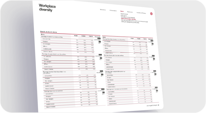 0 - - - - - - - - Workplace diversity Diversity, equity and inclusion Metric FY2021 FY2020 FY2019 Framework Percentage of women in our global workforce CG-MR-330a.1 Total workforce 56% 58% 58% Managers 57% 56% 53% 405-1 Non-managers 56% 58% 59% Officers 44% 41% 40% Leadership team 46% 50% 42% Board of Directors 38% 31% 31% Percentage of people of color in our U.S. workforce CG-MR-330a.1 U.S. workforce 53% 50% 49% Managers 43% 40% 39% 405-1 Non-managers 54% 51% 51% Officers 33% 31% 28% Leadership team 23% 25% 25% Board of Directors 31% 46% 46% Percentage American Indian/Alaska Native in our U.S. workforce CG-MR-330a.1 U.S. workforce <1% <1% <1% 405-1 Managers <1% <1% <1% Non-managers <1% <1% <1% Officers 0% 0% 0% Leadership team 0% 0% 0% Board of Directors 0% 0% 0% Percentage Asian in our U.S. workforce CG-MR-330a.1 U.S. workforce 5% 5% 5% Managers 4% 4% 4% 405-1 Non-managers 5% 5% 5% Officers 10% 10% 10% Leadership team 8% 8% 8% Board of Directors 0% 0% 0% SASB GRI SASB GRI SASB GRI SASB GRI Introduction Environmental Social Governance Indexes and Glossary Social Overview Inside Social Supporting Our Team Members Board and Workplace Diversity Products and Guest Experiences Built on Fairness and Equity Serving and Strengthening Communities Metric Percentage Black/African American in our U.S. workforce U.S. workforce Managers Non-managers Officers Leadership team Board of Directors Percentage Hispanic/Latino in our U.S. workforce U.S. workforce Managers Non-managers Officers Leadership team Board of Directors Percentage Native Hawaiian/Pacific Islander in our U.S. workforce U.S. workforce Managers Non-managers Officers Leadership team Board of Directors Percentage two or more races in our U.S. workforce U.S. workforce Managers Non-managers Officers Leadership team Board of Directors FY2021 16% 13% 16% 10% 8% 15% 28% 23% 28% 10% 8% 15% <1% <1% <1% <1% 0% 0% 3% 3% 3% 2% 0% 0% FY2020 FY2019 Framework CG-MR-330a.1 15% 15% 12% 12% 405-1 15% 16% 9% 5% 8% 8% 23% 15% CG-MR-330a.1 26% 25% 21% 20% 405-1 27% 25% 10% 11% 8% 8% 23% 31% CG-MR-330a.1 <1% <1% 405-1 <1% <1% <1% <1% 0% 0% 0% 0% 0% 0% CG-MR-330a.1 3% 2% 2% 3% 405-1 3% 3% 2% 1% 0% 0% 0% 0% 2022 Target ESG Report 42 SASB GRI SASB GRI SASB GRI SASB GRI