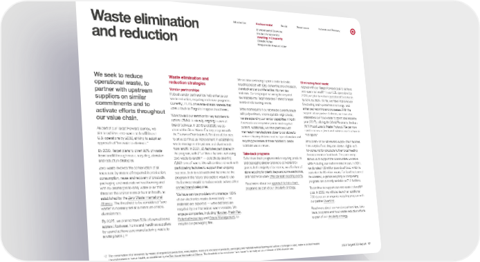 0 Introduction Environmental Social Governance Indexes and Glossary Environmental Overview Waste elimination and reduction Inside Environmental Investing in Circularity Climate Action Responsible Resource Use We seek to reduce operational waste, to partner with upstream suppliers on similar commitments and to activate efforts throughout our value chain. As part of our Target Forward journey, we aim to achieve zero waste to landfill in our U.S. operations by 2030, striving to adopt an approach of “innovate to eliminate.” By 2030, Target plans to divert 90% of waste from landfill through reuse, recycling, donation and reduction strategies. Zero waste involves the conservation of all resources by means of responsible production, consumption, reuse and recovery of products, packaging and materials without burning and with no discharges to land, water or air that threaten the environment or human health, as established by the Zero Waste International Alliance . The threshold to be considered “zero waste” is normally set at a minimum of 90% diversion rate. By 2025, we plan to have 50% of owned brand apparel, footwear, home and hardlines suppliers by spend achieve zero manufacturing waste to landfill ( ZMWL ). 12 Waste elimination and reduction strategies Vendor partnerships Robust vendor partnerships help enhance our waste reduction, recycling and reuse programs. Currently, 71.4% of reverse-stream material that comes back to Target is in apparel and home. Work toward our ambition for key suppliers to achieve ZMWL is already ongoing in owned brand footwear. In 2019 and 2020, we co- created the Shoe Waste Factory program with the Footwear Distributors & Retailers of America to drive continuous improvement in establishing waste management systems and divert waste from landfill. In 2021, 25 factories participated in the program, with 21 of those factories achieving zero waste to landfill 12 — collectively diverting 5,602 tons of waste. We will continue to work with participating factories to support their ongoing success, look to add additional factories to the program in the future and explore ways to use the footwear model to reduce waste across other owned brand categories. We have service providers who manage 100% of our electronics waste domestically — no materials are exported — while batteries are recycled by our hazardous waste vendors. We engage companies, including Novolex , Fresh Pak , Potential Industries and Waste Management , to recycle our packaging film. We are also continuing to pilot a textile-to-textile recycling project with Circ , converting end-of-season, overstock and end-of-life textiles into new raw materials. Our test project is turning the recycled raw material into Target-branded T-shirts for team member volunteering events. While mannequins in our stores are currently made with polyurethane, a nonrecyclable virgin plastic, we are expanding our vendor capabilities in North America to use recyclable plastic and recycled content. Additionally, we have partnered with mannequin manufacturers closer to our stores to reduce shipping distance and set up reclamation and recycling processes at these facilities to create a circular waste stream. Take-back programs Select take-back programs make recycling products and packaging simpler and more convenient for guests. In the majority of our stores, we offer front-of- store recycling for plastic bags and some electronics, and hold twice-yearly child car seat recycling events . Read more about our approach to take-back programs as part of our circularity strategy . Eliminating food waste Aligned with our Target Forward goal to achieve zero waste to landfill 12 in our U.S. operations by 2030, we plan to reduce operational food waste by 50% by 2025. So far, we have improved our forecasting and replenishment strategy, and enhanced reporting and processes. With the support of our partner Anthesis, we have also established our food waste footprint and baseline year (2017), utilizing the World Resources Institute (WRI) Food Loss & Waste Protocol . We can now start to measure, track and address our food waste “hot spots.” Should any of our stores and supply chain facilities have surplus food, they can donate eligible safe- for-consumption products to their local Feeding America member food bank. This partnership allows us to support the communities we serve while reducing our environmental impact. In 2021, we donated 106 million pounds of food, which is equivalent to 88 million meals. For food that cannot be donated, organics recycling or composting programs are currently available at 712 facilities. To continue to support our zero waste to landfill 12 goal, in 2022, we will also launch an additional 700 stores on an organics recycling program with our partner Divert Inc . Read more about our vendor partnerships, take- back programs and food waste reduction efforts as part of our circularity strategy . 12 The conservation of all resources by means of responsible production, consumption, reuse and recovery of products, packaging and materials without burning and with no discharges to land, water or air that threaten the environment or human health, as established by the Zero Waste International Alliance . The threshold to be considered “zero waste” is normally set at a minimum of 90% diversion rate. 2022 Target ESG Report 17