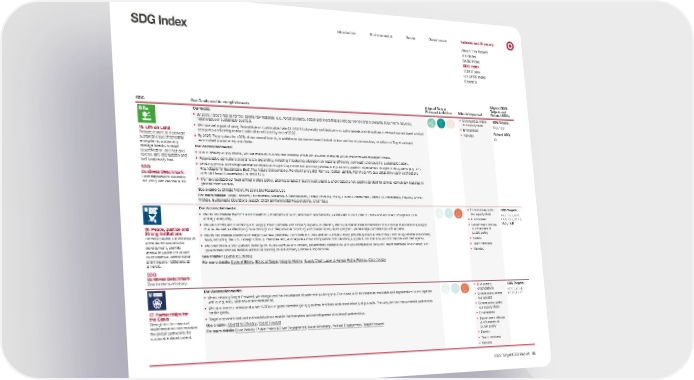 0 II II ' Introduction Environmental Social Governance Indexes and Glossary SDG Index About This Report GRI Index SASB Index SDG Index TCFD Index UNGPRF Index Glossary SDG Our Goals and Accomplishments Aligned Target F orward Ambition Who Is Impacted Aligned SDG T argets and Related SDGs 15. Life on Land Protect, restore and promote sustainable use of terrestrial ecosystems, sustainably manage forests, combat desertification, and halt and reverse land degradation and halt biodiversity loss. SDG Business Benchmark: Land degradation neutrality including zero deforestation. Our Goals: • By 2030, Target intends for the leading raw materials (e.g., forest products, cotton and more) that go into our owned brand products to be 100% recycled, r egenerative or sustainably sourced. • We have set a goal of using Roundtable on Sustainable Palm Oil (RSPO) physically certified palm oil, palm kernels and derivatives in relevant owned brand product cat egories and aiming to trace palm oil to mill level by end of 2022. • By 2025, Target plans for 100% of our owned brands, in addition to our owned brand limited-edition and brand partnerships, to adhere to Target’s already established sustainability standar ds. Our Accomplishments: • In our forestry supply chains, we use chain-of-custody certifications wherever possible to ensure we source from well-managed forests. • Regenerative agriculture programs are expanding, including introducing education on material efficiency, soil health and sourcing sustainable cotton. • Working groups and nongovernmental organizations (NGOs) inform our sourcing policies and push for systemic improvement to agriculture systems (e.g., U.S. Roundtable for Sustainable Beef, The Natur e Conservancy, Field to Market, BCI Farmers, Cotton LEADS, FishWise). We also utilize third-party certifications such as Forest Stewardship Council (FSC). • We have updated our food animal welfare policy, aligning to latest industry best practice, and created a new public standard for animal-derived raw materials in gener al merchandise. See chapters: Climate Action, Responsible Resource Use For more details: Target Forward, Environment, Materials & Deforestation, Forest Products Policy, Cotton Commitment, Palm Oil Commitment, Plastics, Animal W elfare, Sustainable Operations, Supply Chain Environmental Responsibility, Chemicals • Communities within our supply chain • Environment • Vendors SDG Targets: 15.5, 15.9 Related SDG: 12 16. Peace, Justice and Strong Institutions Promote peaceful and inclusive societies for sustainable development, provide access to justice for all and build effective, accountable and inclusive institutions at all levels. SDG Business Benchmark: Zero incidents of bribery. Our Accomplishments: • We do not tolerate discrimination based on protected status or personal characteristics, as detailed in our Code of Ethics and actioned through our DE&I str ategy every day. • We are committed to working with supply chain partners and industry experts to prevent, identify and eradicate forced labor in our global manufacturing supply chains. As well as identifying risks thr ough our Responsible Sourcing and Sustainability audit program, we leverage partnerships with experts. • We do not tolerate unethical or illegal business practices. Our Code of Ethics and Anti-Bribery Policy provide guidance. We comply with all applicable anti-bribery laws, including the U .S. Foreign Corrupt Practices Act, and require similar compliance from vendors, suppliers, contractors, subcontractors and their agents. • We offer online and in-person trainings on topics such as anti-bribery, government interactions and anti-competitive behavior. Team members who interact with government officials r eceive additional training on anti-bribery policies and practices. See chapter: Operating Ethically For more details: Code of Ethics, Ethics at Target, Integrity Hotline, Supply Chain Labor & Human Rights Policies, Civic Activity • Communities within our supply chain • Environment • Government officials & influencers of public policy • Guests • Team members • Vendors SDG Targets: 16.2, 16.3, 16.5, 16.6, 16.7, 16.10, 16.A, 16.B 17. Partnerships for the Goals Strengthen the means of implementation and revitalize the global partnership for sustainable development. Our Accomplishments: • When creating Target Forward, we recognized the importance of partnerships for goals. Our vision is to co-create an equitable and regenerative future together with our guests, par tners and communities. • We take time to understand which SDGs our guest-directed giving grantees feel their work most closely aligns with. This way we can help promote partnership for the goals. • Target corporate and political contributions enable the formation and development of external partnerships. See chapter: Operating Ethically, Target Forward For more details: Civic Activity, Public Policy & Civic Engagement, Issue Advocacy, Political Engagement, Target Forward • Civil society or ganizations • Communities where we oper ate • Communities within our supply chain • Environment • Government officials & influencers of public policy • Guests • Team members • Vendors SDG Targets: 17.13, 17.14, 17.16, 17.17 2022 Target ESG Report 95