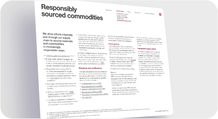 0 Introduction Environmental Social Governance Indexes and Glossary Environmental Overview Responsibly sourced commodities Inside Environmental Investing in Circularity Climate Action Responsible Resource Use We drive efforts internally and through our supply chain to source materials and commodities in increasingly responsible ways. Our standards, goals and commitments include: • By 2030, Target intends for the leading raw mat erials (e.g., forest products, cotton, etc.) that go into our owned brand products to be 100% recycled, regenerative or sustainably sourced. • Being committed to sourcing 100% of our cott on more sustainably for owned and exclusive brand products by 2022 by participating in programs designed to improve cotton growing practices and working conditions. 33 • Sourcing all owned brand paper-based retail packaging fr om sustainably managed forests by 2022. • Rolling out implementation of our Forest P roducts Policy to Threshold and Smith & Hawk en brands by the end of 2022. 34 • Our seafood sustainability commitment to include best pr actice requirements for the use of transshipment in tuna supply chains. • Implementing an animal welfare policy; moving t o source only cage-free shell eggs, pending available supply, by 2025; and by year-end 2022, aim to have 100% of Good & Gather brand fresh pork produced using open pen gestation systems. Good & Gather currently represents the vast majority of all fresh pork sold at Target. As we look to 2022 and beyond, we will continue t o encourage national brand pork suppliers to further reduce and eliminate the number of days sows are housed in gestation crates. Find updates related to this goal and other food animal welfar e commitments on our website. Standards and certifications Third-party standards help provide confidence in the practices used in our supply chain and help encourage positive change. To guide sourcing decisions for our owned brands, our suppliers utilize certifications including: • Forest Stewardship Council (FSC) • Marine Stewardship Council (MSC) • Aquaculture Stewardship Council (ASC) • Best Aquaculture Practices (BAP) • Roundtable on Sustainable Palm Oil (RSPO) • Fair Trade USA We communicate sustainability-related information of int erest to our guests using clear icons on product labels to highlight such certifications. Forestry products In our forestry supply chains, we use chain-of- cust ody certifications wherever possible to confirm that we source from well-managed forests. We prioritize FSC standards and currently have 1,500 FSC-certified owned brand items. We recently participated in a pilot study with auditing and risk mitigation or ganization Preferred by Natur e. The study aimed to identify ways t o minimize forest product risk where chain-of- custody wood supplies are not available. Read more about our Forest Products Policy . Palm oil Since 2019, our suppliers’ procurement of RSPO physically cer tified (Mass Balance, Segregated or Identity Preserved) palm oil, palm kernels and derivatives increased by 37%, and now spans 3,000 products in relevant owned brand categories. 35 We have set a goal of using RSPO physically certified palm oil, palm kernels and derivatives in relevant owned brand product categories, and aim to trace palm oil to mill level by end of 2022. Working closely with our partners at the Earthworm F oundation, we achieved traceability to the mill level for 76% of our palm oil supply in 2021 and ar e working to trace the remaining volumes by the end of 2022. Transparent supply chains With retailers increasingly keen to understand how and where products are made, Target is accelerating its implementation of traceability programs. We are initially focusing on cotton due to its prevalence in our assortment, the regulatory requirements surrounding cotton and our commitment to source cotton more sustainably for owned brand and exclusive national brand products by 2022. Eventually, we aim to achieve full visibility of where the cotton we use is grown, collaborating with farmers, brands, other retailers and organizations that share our commitment. We also intend to track and validate our progress. 33 Target does not accept products containing Turkmen cotton or cotton originating from the Xinjiang province of China, regardless of where they were produced. 34 2020 was a goal year for these two brands and while much was accomplished, the goal of 100% was not realized. However, pursuit of this goal did not end with the passing of the goal date. As of the end of 2021, the composite of these two br ands has reached 92%. 35 Owned brand food, household cleaning, personal care, baby care, beauty, cosmetics and candle products. 2022 Target ESG Report 25
