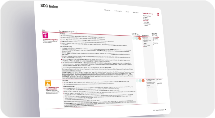 ' II 1111 lllll 0 Introduction Environmental Social Governance Indexes and Glossary SDG Index About This Report GRI Index SASB Index SDG Index TCFD Index UNGPRF Index Glossary SDG Our Goals and Accomplishments Aligned Target F orward Ambition Who Is Impacted Aligned SDG T argets and Related SDGs 10. Reduced Inequalities Reduce inequality within and among countries. Our Goals: • By 2023, we aim to increase representation of Black team members across the company by 20%. • By the end of 2025, we’re committed to spend more than $2 billion with Black-owned businesses. • By 2023, Target aims to increase the promotional rate of people of color and women while reducing the rate of turnover. • Target plans to maintain a balance of male and female team members at every level of our company. • We are committed to working with supply chain partners and industry experts to prevent, identify and eradicate forced labor in our global manufacturing supply chains. Our Accomplishments: • The Racial Equity Action and Change (REACH) committee accelerates work to create racial equity for Black team members, guests and communities. It includes a $100 million investment t o fuel economic prosperity in Black communities, support funding of Black-led nonprofits and sponsor programs elevating Black stories and voices. • Our DE&I strategy is integrated through every business level, guided by continuous listening to and learning from stakeholders and collaboration with leading DE&I gr oups. • We publish an annual Workforce Diversity Report, showing team members are 50% people of color and 58% women. Additionally, people of color were paid 100% of the pay for whit e team members. • We are supporting local, Black-led organizations to ensure resources are designed for the communities they serve. We work with suppliers that are at least 51% owned, contr olled and operated by women, BIPOC, LGBTQIA+, veterans or people with disabilities. • Our inclusive design approach to products, packaging and brands reflects the needs of all guests, regardless of age, gender, race, culture, physical abilities or sensitives, shape or siz e. Additionally, we provide team members with Disabilities Awareness training and a disability toolkit to assist HR partners and leaders in ensuring those with disabilities feel supported and included. • In 2022, we announced a new starting wage range of $15 to $24, depending on the job and the local market. See chapters: Supporting Our Team Members, Board and Workplace Diversity, Products and Guest Experiences Built on Fairness and Equity, Operating Ethically, Promoting and Protecting Human Rights For more details: Target Forward, Diversity, Equity & Inclusion, Target’s 2021 Workforce Diversity Report, Target 2021 EE01 Report, Here are Target’s Latest Actions t o Advance Racial Equity, Racial Equity Action and Change, Target Commits to Spending More Than $2 Billion with Black-Owned Businesses by 2025 , Target P rovides Update on Commitment to Spend $2 Billion with Black-owned Businesses and Announces New Media Fund Initiative , Public Policy & Civic Engagement, Human Rights, Supply Chain Labor & Human Rights Policies, Supply Chain Social Responsibility, Ethics at Target, Standards of Vendor Engagement, Responsible Sour cing Audit Program, Responsible Sourcing Operations • Civil society or ganizations • Communities where we oper ate • Guests • Team members • Vendors SDG Targets: 10.1, 10.2, 10.3, 10.4 Related SDG: 5 11. Sustainable Cities and Communities Make cities and human settlements inclusive, safe, resilient and sustainable. Our Goals: • By 2025, Target and Target Foundation plan to evolve our philanthropic practices and place-based solutions to invite participation from communities. • By 2030, engage and elevate community voices as we seek to build and implement community-driven solutions. Our Accomplishments: • In 2021, we announced a $100 million investment through 2025 to help fuel economic prosperity in Black communities across the country. We’re doing so by suppor ting local, Black-led organizations to ensure that resources are specifically designed for the communities they serve. • Target provided more than $3 million to support communities impacted by natural disasters and humanitarian crises in 2021. • Target has invested more than $1 billion in the health and safety of our team members and communities since the start of the COVID-19 pandemic, including more than $15 million t o global, national and local community response and vaccine equity. • When disasters occur, we partner with nonprofit organizations to help those in need and support our team members and guests. Some of our recent efforts include suppor t to communities affected by the Marshall Fire, Southern and Midwestern tornadoes, Hurricane Ida, the Haiti earthquake, Afghan refugee resettlement, India coronavirus relief and Winter storm Uri. See chapters: Products and Guest Experiences Built on Fairness and Equity For more details: Target Forward, Target Foundation, Inside Target’s $100 Million Investment in Black Communities , Our Latest Effort in Our Commitment to Advancing Racial Equity, We’re Enhancing Our Target Scholars Program, with Scholarship Extensions *And* New Resources — Take a Look, Safety & Preparedness, Community & Store Safety, Disaster Preparedness & Response • Communities where we oper ate • Communities within the supply chain • Guests • Team members SDG Targets: 11.3, 11.7 Related SDG: 7, 9 2022 Target ESG Report 92
