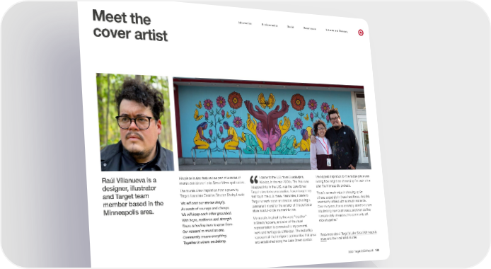0 '' Meet the cover artist Introduction Environmental Social Governance Indexes and Glossary Raúl Villanueva is a designer, illustrator and Target team member based in the Minneapolis area. His piece is also featured as part of a series of murals outside our Lake Street Minneapolis store. The murals draw inspiration from a poem by Target Associate Creative Director Shelby Lewis: We will root our stories deeply. As seeds of courage and change. We will keep each other grounded. With hope, resilience and strength. There is healing here to grow from. Our renewal to stand as one. Community means everything. Together is where we belong. “ I came to the U.S. from Guadalajara, Mexico, in the mid-2000s. The first store I stepped into in the U.S. was the Lake Street Target store to buy necessities. I even bought my first toy in the U.S. there. Years later, I came to Target to work as an art director, and creating a permanent mural for the exterior of this particular store is a full-circle moment for me. My mural is inspired by the word “together” in Shelby’s poem, and a lot of the visual representation is connected to my personal work and heritage as a Mexican. The butterflies represent all the immigrant communities that grew and established along the Lake Street corridor. The biggest inspiration for the middle piece was seeing how neighbors showed up for each other after the Minneapolis protests. There’s so much value in showing up for others, especially in these hard times. And this community is filled with so much resilience. Over the years, I’ve seen empty storefronts turn into thriving new businesses, and even as they navigate daily struggles, this community still sticks together.” Read more about Target’s Lake Street Minneapolis store and the local artist murals. 2022 Target ESG Report 108