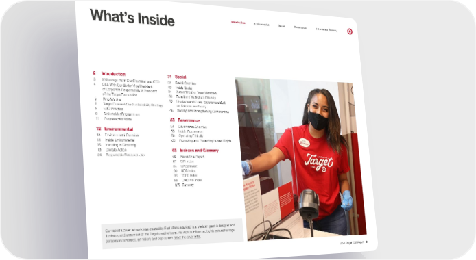 0 Introduction Environmental Social Governance Indexes and Glossary What’s Inside 2 Introduction 3 A Message From Our Chairman and CEO 4 Q&A With Our Senior Vice President of Corporate Responsibility & President of the Target Foundation 5 Who We Are 6 Target Forward: Our Sustainability Strategy 8 ESG Priorities 9 Stakeholder Engagement 11 Progress Highlights 12 Environmental 13 Environmental Overview 14 Inside Environmental 15 Investing in Circularity 19 Climate Action 24 Responsible Resource Use 31 Social 32 Social Overview 33 Inside Social 34 Supporting Our Team Members 39 Board and Workplace Diversity 43 Products and Guest Experiences Built on Fairness and Equity 46 Serving and Strengthening Communities 53 Governance 54 Governance Overview 55 Inside Governance 56 Operating Ethically 63 Promoting and Protecting Human Rights 65 Indexes and Glossary 66 About This Report 67 GRI Index 84 SASB Index 89 SDG Index 96 TCFD Index 99 UNGPRF Index 105 Glossary Our report’s cover artwork was created by Raúl Villanueva. Raúl is a Mexican graphic designer and illustrator, and a member of the Target creative team. His work is influenced by his cultural heritage, personal experiences, art history and pop culture. Meet the cover artist . 2022 Target ESG Report 2