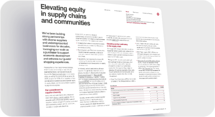 0 Introduction Environmental Social Governance Indexes and Glossary Social Overview Elevating equity in supply chains and communities Inside Social Supporting Our Team Members Board and Workplace Diversity Products and Guest Experiences Built on Fairness and Equity Serving and Strengthening Communities We’ve been building strong partnerships with diverse suppliers and underrepresented businesses for decades, leveraging our scale as a purchaser to support economic development and enhance our guests’ shopping experiences. Propelled by our new Target Forward strategy, which focuses on creating an equitable and regenerative future, we’re advancing equity beyond the Board and workplace to our supply chain, as well as the communities we serve . By 2025, we plan for 100% of our suppliers to have policies and programs to advance gender equity in supply chains, and for owned brand suppliers to pay workers digitally. Our commitment to supplier diversity Every year, we work hard to find, attract and retain more diverse-owned suppliers . We are proud to work with an ever-growing roster of suppliers that are at least 51% owned, controlled and operated by women, BIPOC, LGBTQIA+, veterans or people with disabilities. In April 2021, as part of our REACH commitments , we launched our plan to spend more than $2 billion with Black-owned businesses by the end of 2025. This commitment involves: • Increasing the number of products from Black- owned businesses to more than 500 across our stores and online. • Spending more with Black-owned companies, including marketing agencies, construction companies, facilities maintenance providers and others. • Establishing new resources to engage with early-stage historically under-resourced entrepreneurs to provide education on scaling for mass retail. To that end, we build relationships with such suppliers through multiple national business groups, including the National Minority Supplier Development Council and National LGBT Chamber of Commerce . In addition, together with the Women’s Business Enterprise National Council (WBENC) , we are a founding partner and premier sponsor of Women Owned in Retail , a program designed to help women-owned consumer goods businesses thrive in the retail space. We also host onsite and virtual summits to introduce Target merchants and others to potential new, diverse partners. Globally, we are working to extend supplier diversity within our international supply chain. We have identified three priorities — women, people with disabilities and other underrepresented groups — and have connected with WeConnect (the global women’s partner to WBENC, an entity with operations in the U.S. only) and Disability:IN to support this work. Elevating worker well-being in the supply chain We engage with strategic stakeholders to address issues that matter to supply chain workers. By the end of fiscal year 2021, our collaborative projects related to worker well-being impacted the lives of more than 3.7 million people. Throughout 2021, we pivoted our worker well- being approach toward our 2025 goals, which focus on gender equity and the digitization of wages for workers in our owned brand supply chain. We began working to align our strategies with external organizations that enable thought partnership and future progress. Below are examples of partnerships that exemplify this approach. • Better Than Cash Alliance (BTCA) : We became a member of this UN-based alliance in 2022 to Accelerators support our commitment that all owned brand suppliers pay workers digitally by 2025, following responsible practices. • CARE : Target continues to partner with CARE International, designing strategies to drive gender equity throughout our sourcing practices and extended supply chain. • BSR : Target supports BSR’s HERproject to empower female supply chain workers through workplace-based health, financial inclusion and gender equality interventions. • International Center for Research on Women (ICRW) : Through our partnership with the center’s advisory arm, ICRW Advisors, Target is contributing to the further development of ICRW’s Self-Diagnostic Tool . This industry- aligned resource helps factories assess their gender equity policies and processes and generates a customized scorecard on existing gender integration policies and practices to encourage continuous improvement. Metric FY2021 FY2020 FY2019 Number of companies supported by Target Accelerators during the fiscal year Target Takeoff 31 25 17 Target Incubator 0 8 8 Target Technology Accelerator 0 10 9 Target Accelerator Program India 5 10 10 Number of products on shelves in Target stores from graduates of Target Accelerators (SKUs) 220 123 59 2022 Target ESG Report 51