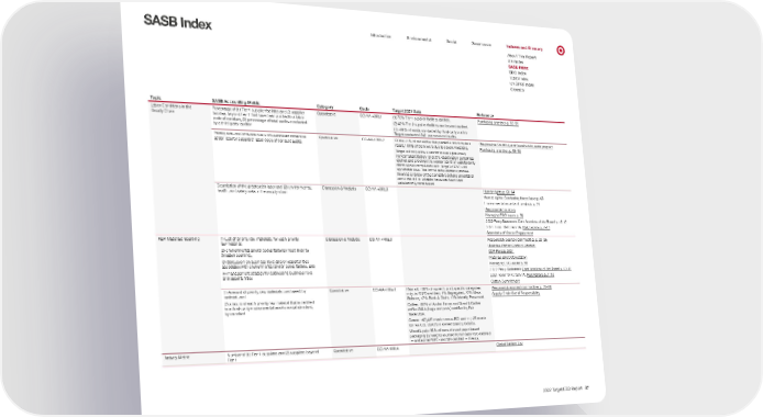 0 Introduction Environmental Social Governance Indexes and Glossary SASB Index About This Report GRI Index SASB Index SDG Index TCFD Index UNGPRF Index Glossary Topic SASB Accounting Metric Category Code Target 2021 Data Reference Labor Conditions in the Supply Chain Percentage of (1) Tier 1 supplier facilities and (2) supplier facilities beyond Tier 1 that have been audited t o a labor code of conduct, (3) percentage of total audits conducted by a third-party auditor Quantitative CG-AA-430b.1 (1) 70% Tier 1 supplier facilities audited. (2) 42% Tier 2 supplier facilities and beyond audited. (3) >99% of audits conducted by third-party auditor Target conduct ed 243 unannounced audits. Purchasing practices p. 58–59 Priority non-conformance rate and associated corrective action rate for suppliers’ labor code of conduct audits Quantitative CG-AA-430b.2 Of the <1% of our audits that yielded a noncompliant r esult, 100% of them were due t o severe violations. Target will only allow a vendor to use a previously noncompliant factory once the deactivation period has e xpired and provided the vendor can then satisfactorily demonstrate compliance with Target’s SOVE and applicable laws. The formal reinstatement process involves a review of the corrective actions undertaken and a reaudit to validate the issues have been satisfactorily remediated. Responsible Sourcing and Sustainability audit program Purchasing practices p. 58–59 Description of the greatest (1) labor and (2) environmental, health, and safety risks in the supply chain Discussion & Analysis CG-AA-430b.3 Human rights p. 63–64 Human rights: Combating forced labor p. 63 Environmental impacts of products p. 24 Responsible Sourcing Managing ESG issues p. 56 2022 Proxy Statement: Core functions of the Board p. 13–17 2021 Form 10-K: Item 1A. Risk Factors p. 7–13 Standards of Vendor Engagement Raw Materials Sourcing (1) List of priority raw materials; for each priority raw material: (2) environmental and/or social factor(s) most likely to threaten sour cing, (3) discussion on business risks and/or opportunities associated with environmental and/or social fact ors, and (4) management strategy for addressing business risks and opportunities Discussion & Analysis CG-AA-440a.3 Responsibly sourced commodities p. 25–26 Business P artner Code of Conduct CDP Forests 2021 Materials and Deforestation Managing ESG issues p. 56 2022 Proxy Statement: Core functions of the Board p. 13–17 2021 Form 10-K: Item 1A. Risk Factors p. 7–13 Cotton Commitment (1) Amount of priority raw materials purchased, by material, and (2) amount of each priority r aw material that is certified to a third-par ty environmental and/or social standard, by standard Quantitative CG-AA-440a.4 Palm oil: 100% of owned brand, specific categories only, is RSPO certified: 1% Segregat ed, 72% Mass Balance, 17% Book & Claim, 10% Identify Preserved. Coffee: 100% of Archer Farms and Good & Gather coffee SKUs (bags and pods) certified by F air Trade USA. Cotton: 167,425 metric tonnes BCI and 11,125 metric tonnes U.S. LEADS in owned br and products. Wood & pulp: 86% of owned brand paper-based packaging (by weight) sourced from mostly FSC-certified — and some PEFC- and SFI-certified — forests. Responsibly sourced commodities p. 25–26 Supply Chain Social Responsibility Activity Metric Number of (1) Tier 1 suppliers and (2) suppliers beyond Tier 1 Quantitative CG-AA-000.A Global Fact ory List 2022 Target ESG Report 87 SASB Apparel, Accessories & Footwear Standard