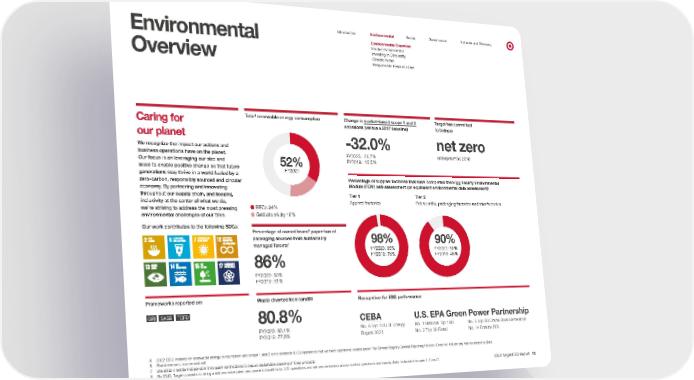 Introduction Environmental Social Governance Indexes and Glossary Environmental Overview Environmental Overview Inside Environmental Caring for our planet We recognize the impact our actions and business operations have on the planet. Our focus is on leveraging our size and scale to enable positive change so that future generations may thrive in a world fueled by a zero-carbon, responsibly sourced and circular economy. By partnering and innovating throughout our supply chain, and keeping inclusivity at the center of what we do, we’re striving to address the most pressing environmental challenges of our time. Our work contributes to the following SDGs : 6 ~~~~~~ 2:iGEJI m ~ 7~~D ,,, .:-e~ ,,, 15 ::...., I 12=. """""""" CX) 17::'J:':'::: @ 13: ~ 14 :nwwATIH ........... ........... Frameworks reported on: GRI SASB TCFD G G G 9 ,. --- •-:: • • 0 Total 5 renewable energy consumption 34+18+48+ 52% FY2021 RECs 34% Grid electricity 18% Percentage of owned brand 6 paper-based packaging sourced from sustainably managed forests 7 86% FY2020: 63% FY2019: 51% Waste diverted from landfill 80.8% FY2020: 80.1% FY2019: 77.5% Investing in Circularity Climate Action Responsible Resource Use Change in market-based scope 1 and 2 emissions (versus a 2017 baseline) Target has committed to being a -32.0% net zero FY2020: -26.7% FY2019: -10.5% enterprise 8 by 2040 Percentage of supplier factories that have completed the Higg Facility Environmental Module (FEM) self-assessment (or equivalent environmental data assessment) Tier 1 Tier 2 Apparel factories Fabric mills, packaging factories and trim factories 98++2 90+10+ Recognition for ESG performance CEBA U.S. EPA Green Power Partnership No. 8 Top 10 U.S. Energy No. 1 National Top 100 No. 3 Top 30 Onsite Solar Generation Buyers 2021 No. 2 Top 30 Retail No. 14 Fortune 500 2022 ESG: metrics for renewable energy consumption and scope 1 and 2 is for domestic (U.S.) operations that we have operational control under The Climate Registry General Reporting Protocol. Does not include any metrics related to Shipt. 6 Brand we own, source and sell. 7 We utilize credible independent third-party certifications to ensure sustainable sourcing of forest products 8 By 2040, Target commits to being a net zero enterprise: zero waste to landfill in its U.S. operations and net zero emissions across both its operations and supply chain, inclusive of scopes 1, 2 and 3. 2022 Target ESG Report 13 34+ 98+ 18+48+G 2+G 90+10+G 52% FY2021 90% FY2020: 56% FY2019: 48% 98% 98% 90% FY2020: 85% FY2020: 85% FY2020: 56% FY2019: 78% FY2019: 78% FY2019: 48% 5
