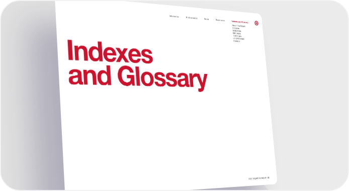 Target ESG Report Page 64 Page 660 Introduction Environmental Social Governance Indexes and Glossary About This Report GRI Index SASB Index SDG Index TCFD Index UNGPRF Index Glossary Indexes and Glossary 2022 Target ESG Report 65