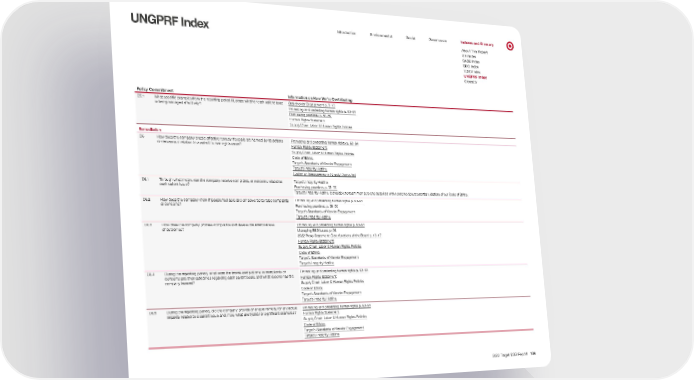 0 UNGPRF Index Introduction Environmental Social Governance Indexes and Glossary About This Report GRI Index SASB Index SDG Index TCFD Index UNGPRF Index Glossary Policy Commitment Information on How We’re Contributing C5.1 What specific examples from the reporting period illustrate whether each salient issue is being managed effectively? Stakeholder Engagement p. 9–10 Promoting and protecting human rights p. 63–64 Purchasing practices p. 58–59 Human Rights Statement Supply Chain Labor & Human Rights Policies Remediation C6 How does the company enable effective remedy if people are harmed by its actions or decisions in r elation to a salient human rights issue? Promoting and protecting human rights p. 63–64 Human Rights Statement Supply Chain Labor & Human Rights Policies Code of Ethics Target’s Standards of Vendor Engagement Target’s Integrity Hotline California Transparency in Supply Chains Act C6.1 Through what means can the company receive complaints or concerns related to each salient issue? Target’s Integrity Hotline Purchasing practices p. 58–59 Target’s Integrity Hotline is available to team members and suppliers with concerns about potential violations of our Code of Ethics. C6.2 How does the company know if people feel able and empowered to raise complaints or concerns? Promoting and protecting human rights p. 63–64 Purchasing practices p. 58–59 Target’s Standards of Vendor Engagement Target’s Integrity Hotline C6.3 How does the company process complaints and assess the effectiveness of outcomes? Promoting and protecting human rights p. 63–64 Managing ESG issues p. 56 2022 Proxy Statement: Core functions of the Board p. 13–17 Human Rights Statement Supply Chain Labor & Human Rights Policies Code of Ethics Target’s Standards of Vendor Engagement Target’s Integrity Hotline C6.4 During the reporting period, what were the trends and patterns in complaints or concerns and their outcomes r egarding each salient issue, and what lessons has the company learned? Promoting and protecting human rights p. 63–64 Human Rights Statement Supply Chain Labor & Human Rights Policies Code of Ethics Target’s Standards of Vendor Engagement Target’s Integrity Hotline C6.5 During the reporting period, did the company provide or enable remedy for any actual impacts r elated to a salient issue and, if so, what are typical or significant examples? Promoting and protecting human rights p. 63–64 Human Rights Statement Supply Chain Labor & Human Rights Policies Code of Ethics Target’s Standards of Vendor Engagement Target’s Integrity Hotline 2022 Target ESG Report 104 Tracking performance
