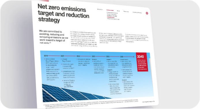 0 2019 2021 2022 2023 2025 2030 2040 Achieve net zero GHG emissions 15 across all scopes by 2040 (10 years ahead of the Paris Agreement). Climate Action Introduction Environmental Social Governance Indexes and Glossary Environmental Overview Net zero emissions target and reduction strategy Inside Environmental Investing in Circularity Climate Action Responsible Resource Use Our emissions commitments are ambitious, and we recognize the challenge ahead in reducing our impact while still growing our business. But this does not deter us from our work to avoid, reduce and remove emissions from the value chain. Through Target Forward, we are adopting sustainable practices such as increasing our use of renewable energy and driving energy efficiency. We have joined the Business Ambition for 1.5 ° C The timeline shows how we have ramped up our ambition, starting in 2019, and how we are looking to achieve net zero GHG emissions 15 across scopes 1, 2 and 3, by 2040 (10 years ahead of the Paris Agreement). We are committed to avoiding, reducing and removing emissions as we work toward a target of net zero. 15 and Race to Zero campaigns so that our emissions contribute to no more than 1.5°C warming, as outlined by the Intergovernmental Panel on Climate Change (IPCC) , and drive meaningful change across our sector. • Set our Science Based Targets initiative (SBT i)-approved goal to reduce absolute scope 1 and 2 emissions and scope 3 GHG emissions from retail purchased goods and services (PGS) 30% by 2030 from a 2017 baseline. • Unveiled Target For ward. • Achieved 30% absolute reduction in emissions (scopes 1 and 2) from a 2017 baseline. Scope 3: Scope 1: Scope 1 and 2: • Aim for 80% of suppliers by spend — covering all PGS — to set science-based reduction targets for scope 1 and 2 GHG emissions by 2023. • Aim to source 60% of our electricity from renewable sources for our operations. • Aim to source 100% of our electricity from renewable sources for our global oper ations. • Announced our goal of net zero GHG emissions by 2040. 15 • Updated scope 1 and 2 emissions reduction goal to 50% by 2030 from a 2017 baseline. • Joined the Business Ambition for 1.5°C and Race to Zero campaigns . Scope 3: • Engage suppliers to prioritize renewable energy and collaborate on solutions that protect, sustain and restore nature. • Aim to have at least 50% of the energy used in strategic and joint business partner owned operations come from renewables. • Aim to achieve 50% absolute reduction in operations emissions (scopes 1 and 2) from a 2017 baseline. Scope 3: • Aim to achieve 30% absolute reduction in supply chain emissions (scope 3) covering retail PGS from a 2017 baseline. 15 Net zero , as defined, is achieved when a company’s scope 1, 2 and 3 emissions are reduced to a level that is consistent with a 1.5 ° C pathway, and any residual emissions are removed from the atmosphere through either nature-based or technological carbon removal solutions (e.g., forestry, regenerative agriculture, carbon capture technology), by no later than 2050. Target has committed to being a net zero enterprise by 2040 — zero waste to landfill in U.S. operations and net zero emissions across both our operations and supply chain, inclusive of scopes 1, 2 and 3. 2022 Target ESG Report 19 2040