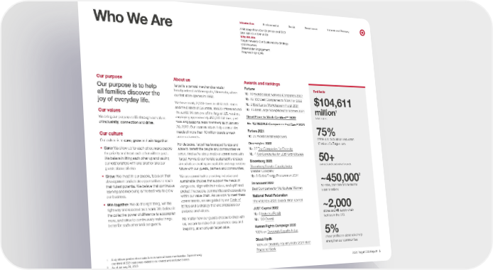 0 Introduction Environmental Social Governance Indexes and Glossary A Message From Our Chairman and CEO Who We Are Q&A With Our SVP of CR Our purpose Our purpose is to help all families discover the joy of everyday life. Our values We bring our purpose to life through our values of inclusivity , connection and drive . Our culture Our culture is to care , grow and win together : • Care: We show up for each other, make people the priority and treat each other with respect. We believe in lifting each other up and valuing our relationships with one another and our guests above all else. • Grow: We invest in our people, focus on their development and create opportunities to reach their fullest potential. We believe that continuous learning and improving is the best way to grow our business. • Win together: We do the right thing, win the right way and succeed as a team. We believe in the collective power of difference to accomplish more, and strive to continuously make things better for each other and our guests. About us Target is a general merchandise retailer headquartered in Minneapolis, Minnesota, where our first store opened in 1962. We have nearly 2,000 stores in all 50 U.S. states and the District of Columbia, and 20 offices around the world. We are one of the largest U.S. retailers, employing approximately 450,000 full-time, part- time and seasonal team members as of January 29, 2022. Our team members help us meet the needs of more than 40 million guests a week across channels. For decades, Target has leveraged its size and scale to benefit the people and communities we serve. And we’ve deepened our commitment with Target Forward , our holistic sustainability strategy aimed at co-creating an equitable and regenerative future with our guests, partners and communities. We are committed to providing inclusive and sustainable choices that support the needs of our guests, align with their values, and uplift and protect the people, communities and ecosystems within our value chain. As we work to meet these commitments, we are guided by our Code of Ethics and a strategy that encompasses our purpose and values. No matter how our guests choose to shop with us, we aim to make their experience easy and inspiring, at an only-at-Target value. Who We Are Target Forward: Our Sustainability Strategy ESG Priorities Stakeholder Engagement Progress Highlights Awards and rankings Fortune No. 19 World’s Most Admired Companies 2022 No. 12 100 Best Companies to Work For 2022 No. 2 Best Large Workplaces in Retail 2021 No. 13 Best Large Workplaces for Women 2021 Great Place to Work-Certified™ 2022 No. 23 PEOPLE Companies that Care® 2021 Forbes 2021 No. 25 World’s Best Employers DiversityInc 2022 No. 27 Top Companies for Diversity No. 4 Top Companies for LGBTQ Employees Bloomberg 2022 Bloomberg Gender-Equality Index Member Company No. 8 Global Energy Procurement 2021 Seramount 2022 Best Companies for Multicultural Women National Retail Federation The Visionary 2022 award: Brian Cornell JUST Capital 2022 No. 6 Industry (Retail) No. 100 Overall Human Rights Campaign 2022 100% on Corporate Equality Index Disability:IN 100% on Disability Equality Index 2021 Best Places to Work Fast facts $104,611 million 1 total sales 75% of the U.S. population lives within 10 miles of a Target store 50+ owned and exclusive brands ~450,000 2 full-time, part-time and seasonal team members ~2,000 stores and 49 supply chain facilities in the U.S. 5% of our profits are donated to help strengthen our communities 1 A significant portion of our sales is from national brand merchandise. Approximately one-third of 2021 sales was related to our owned and exclusive brands. 2 As of January 29, 2022. 2022 Target ESG Report 5