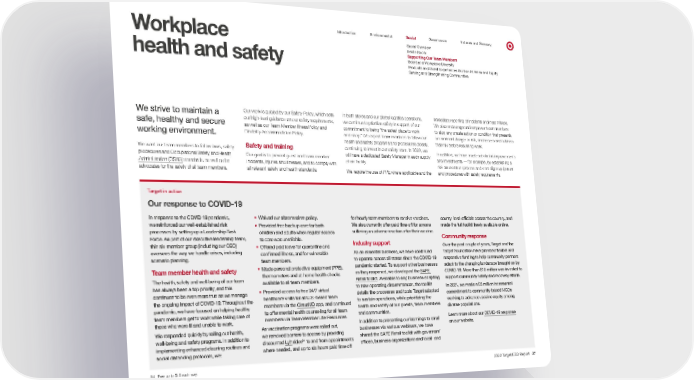 0 Introduction Environmental Social Governance Indexes and Glossary Social Overview Workplace health and safety Inside Social Supporting Our Team Members Board and Workplace Diversity Products and Guest Experiences Built on Fairness and Equity Serving and Strengthening Communities We strive to maintain a safe, healthy and secure working environment. We want our team members to follow laws, safety procedures and Occupational Safety and Health Administration (OSHA) standards, as well as be advocates for the safety of all team members. Our work is guided by our Safety Policy, which sets out high-level guidance on our safety requirements, as well as our Team Member Illness Policy and Disability Accommodation Policy. Safety and training Our goal is to prevent guest and team member incidents, injuries and illnesses, and to comply with all relevant safety and health standards. In both stores and our global logistics operations, we continue to prioritize safety in support of our commitment to being “the safest place to work and shop.” We expect team members to follow our health and safety programs and procedures closely, continuing to invest in our safety team. In 2022, we will have a dedicated Safety Manager in each supply chain facility. We require the use of PPE where applicable and the immediate reporting of incidents and near misses. We also encourage and empower team members to stop any unsafe action or condition that presents an imminent danger or risk, and assess and address that risk before resuming work. In addition, we have made substantial improvements and investments — for example, by establishing a risk assessment process to better align equipment and procedures with safety requirements. Target in action Our response to COVID-19 In response to the COVID-19 pandemic, we reinforced our well-established risk processes by setting up a Leadership Task Force. As part of our executive leadership team, this six-member group (including our CEO) oversees the way we handle crises, including scenario planning. Team member health and safety The health, safety and well-being of our team has always been a top priority, and this continues to be even more true as we manage the ongoing impact of COVID-19. Throughout the pandemic, we have focused on helping healthy team members get to work while taking care of those who were ill and unable to work. We responded quickly by rolling out health, well-being and safety programs. In addition to implementing enhanced cleaning routines and social distancing protocols, we: • Waived our absenteeism policy. • Provided free backup care for both children and adults when regular access to care was unreliable. • Offered paid leave for quarantine and confirmed illness, and for vulnerable team members. • Made personal protective equipment (PPE), thermometers and at-home health checks available to all team members. • Provided access to free 24/7 virtual healthcare visits for all U.S.-based team members via the CirrusMD app, and continued to offer mental health counseling for all team members via Team Member Life Resources. As vaccination programs were rolled out, we removed barriers to access by providing discounted Lyft rides 54 to and from appointments where needed, and up to six hours paid time off for hourly team members to receive vaccines. We also currently offer paid time off for anyone suffering an adverse reaction after their vaccine. Industry support As an essential business, we have continued to operate across all states since the COVID-19 pandemic started. To support other businesses as they reopened, we developed the SAFE Retail toolkit . Available to any business adapting to new operating circumstances, the toolkit details the processes and tools Target adopted to sustain operations, while prioritizing the health and safety of our guests, team members and communities. In addition to presenting our learnings to small businesses via various webinars, we have shared the SAFE Retail toolkit with governors’ offices, business organizations and local- and county-level officials across the country, and made the full toolkit freely available online. Community response Over the past couple of years, Target and the Target Foundation have provided flexible and responsive funding to help community partners adapt to the changing landscape brought on by COVID-19. More than $10 million was invested to support community safety and recovery efforts. In 2021, we made a $5 million incremental commitment to community-based NGOs working to advance vaccine equity among diverse populations. Learn more about our COVID-19 response on our website. 54 Free up to $15 each way. 2022 Target ESG Report 37