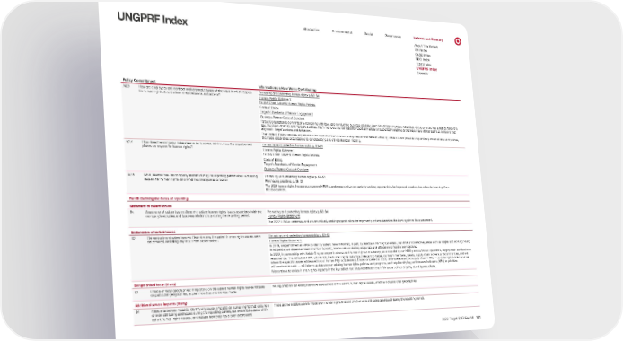 0 UNGPRF Index Introduction Environmental Social Governance Indexes and Glossary About This Report GRI Index SASB Index SDG Index TCFD Index UNGPRF Index Glossary Policy Commitment Information on How We’re Contributing A2.3 How are employees and contract workers made aware of the ways in which respect for human rights should inform their decisions and actions? Promoting and protecting human rights p. 63–64 Human Rights Statement Supply Chain Labor & Human Rights Policies Code of Ethics Target’s Standards of Vendor Engagement Business Partner Code of Conduct Target Corporation is committed to complying with laws and conducting business ethically. Each Target team member, regardless of role or entity, has a duty to follow the law , the Code of Ethics and Target’s policies. Team members are obligated to report any actual or suspected violations and always make ethical business decisions that align with Target’s values and behaviors. The Code of Ethics provides expectations for team member conduct and guides ethical decision-making. While it is not possible to specifically cover all laws and policies, the Code establishes e xpectations to consistently guide ethical decision-making. A2.4 How does the company make clear in its business relationships the importance it places on r espect for human rights? Promoting and protecting human rights p. 63–64 Human Rights Statement Supply Chain Labor & Human Rights Policies Code of Ethics Target’s Standards of Vendor Engagement Business Partner Code of Conduct A2.5 What lessons has the company learned during the reporting period about achieving r espect for human rights, and what has changed as a result? Promoting and protecting human rights p. 63–64 Purchasing practices p. 58–59 The 2022 human rights impact assessment (HRIA) is underway and we are actively seeking opportunities for improved practices based on the learnings from the assessment. Part B: Defining the focus of reporting Statement of salient issues B1 Statement of salient issues: State the salient human rights issues associated with the company’ s activities and business relationships during the reporting period. Promoting and protecting human rights p. 63–64 Human Rights Statement The 2022 HRIA is underway and we are actively seeking opportunities for improved practices based on the learnings from the assessment. Explanation of salient issues B2 Determination of salient issues: Describe how the salient human rights issues were det ermined, including any input from stakeholders. Promoting and protecting human rights p. 63–64 Human Rights Statement In 2019, we performed an HRIA to identify salient risks. Informed, in part, by feedback from rightsholders, the HRIA uncovered key areas such as wages and working hours; in r esponse, we expanded team member benefits, increased our starting wage rate and offered more flexible work options. In 2022, in partnership with Article One, an expert business and human rights consultancy, we are updating our HRIA process for our operations, supply chain and business r elationships. The refreshed HRIA will identify the human rights risks most relevant to Target, our team members, guests, supply chain workers and communities, and will inform the specific issues addressed in our Human Rights Statement. Once completed in 2022, both operational and supply chain HRIAs — and the rightsholder input we will continue to seek — will inform updates to our existing human rights policies and programs, and help identify key performance indicators (KPIs) to prioritize. We continue to review human rights impacts in the key salient risk areas identified in the HRIA as part of our ongoing due diligence efforts. Geographical focus (if any) B3 Choice of focal geographies: If reporting on the salient human rights issues focuses on par ticular geographies, explain how that choice was made. We reported on our enterprise-wide assessment of the salient human rights issues, which is inclusive of all geographies. Additional severe impacts (if any) B4 Additional severe impacts: Identify any severe impacts on human rights that occurred or wer e still being addressed during the reporting period, but which fall outside of the salient human rights issues, and explain how they have been addressed. There are no notable severe impacts on human rights that occurred or were still being addressed during the reporting period. 2022 Target ESG Report 101 Embedding respect