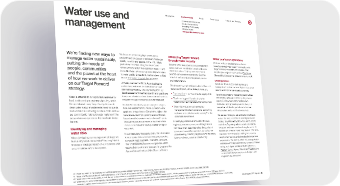 0 Introduction Environmental Social Governance Indexes and Glossary Environmental Overview Water use and management Inside Environmental Investing in Circularity Climate Action Responsible Resource Use We’re finding new ways to manage water sustainably, putting the needs of people, communities and the planet at the heart of how we work to deliver on our Target Forward strategy. Water is essential to our agricultural materials for food, textile products and manufacturing, and in the operation of every Target facility. Access to clean water is also a fundamental need for guests and communities all along our value chain, and we are committed to help build water resiliency in the areas where we operate so this need can always be met. Identifying and managing water risks When developing our management strategy, we first identify water-related risks 40 that may have a financial or strategic impact on our business and/ or communities where we operate. We focus on addressing high-priority areas, products and processes to safeguard freshwater quality, quantity and access. In the U.S., this is particularly important along the West Coast — where water scarcity 41 is a significant issue — and in the Northeast where our greatest impacts relate to water quality. Since 2018, we have been guided by our freshwater stewardship approach . Annually, we use the WRI’s Aqueduct tool to understand water risk for both domestic and international facilities. One key finding from our latest assessment was that quantity and quality are issues we should continue to monitor and work to mitigate through increasingly robust measures. In domestic locations, we are using the insights from this assessment to inform our latest water goals and to accelerate efforts in the highest-risk watersheds, identifying priority areas of impact based on withdrawals in water-stressed 42 areas. This will help us focus efforts at facilities where there’s current and/or future potential for higher water risk. In our manufacturing supply chain, this information is incorporated into a hotspot mapping exercise, alongside Higg FEM data. This helps us assess their environmental footprint and prioritize which supply chain locations to focus on for programs like Apparel Impact Institute (Aii)’s Clean by Design. Advancing Target Forward through water security Securing water resources is a key consideration across both our sustainable brands and waste elimination pillars. Only by conserving water sources can we deliver sustainably sourced materials and operations that protect, sustain and restore nature. We draw on key partnerships to direct efforts and reduce our impact, with a strategic focus on: • Food and fiber in our raw material supply chain. • Textile and apparel factories in priority watersheds in our manufacturing supply chain. • Water risk reduction and stormwater management in direct operations, supporting resilience and collective water security 43 in the communities we serve. In identifying water risks and water-stressed regions where we operate, we will begin to set new value chain goals that reflect the context of our water stewardship approach, as well as our understanding of setting targets around the nexus between climate, water and biodiversity. Water use in our operations While we work on developing new science- based contextual water goals in connection with Target Forward, we continue to operate under the principles originally outlined in our Freshwater Stewardship Approach to guide our ongoing work. Direct operations Across our stores, supply chain facilities and headquarters locations, we’re acting to reduce water scarcity and improve water quality outcomes. Target is recognized for maintaining best practices in managing stormwater and the quality of water leaving our sites. Many of our facilities have stormwater management systems in place, and we partner with local organizations to improve infrastructure and benefit local watersheds. We are also refining our salt application practices to reduce the amount of chloride entering local water bodies. Target has many sites where salt is used to maintain safety during adverse weather conditions for guests and team members during the winter. To address any impacts the salt may have on local lakes and rivers, we refreshed our training at our stores, supply chain facilities and other sites that experience snow events. The training, which includes application techniques and disposal methods, is based on smart salting techniques developed by the Minnesota Pollution Control Agency . We will continue to evolve our approach as new practices, techniques and equipment are developed. 40 Water risk refers to the possibility of an entity experiencing a water-related challenge (e.g., water scarcity, water stress, flooding, infrastructure decay, drought). Source: CEO Water Mandate 41 Water scarcity refers to the volumetric abundance, or lack thereof, of freshwater resources. Source: CEO Water Mandate 42 Water stress refers to the ability, or lack thereof, to meet human and ecological demand for freshwater. It considers several aspects, including water availability, quality and accessibility. Source: CEO Water Mandate 43 Water security refers to the capacity of a population to safeguard sustainable access to adequate quantities of acceptable quality water for sustaining livelihoods, human well-being and socioeconomic development, for ensuring protection against water-borne pollution and water-related disasters, and for preserving ecosystems in a climate of peace and political stability. Source: IPCC WGII Sixth Assessment Report 2022 Target ESG Report 28