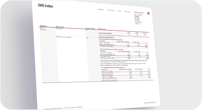 0 Introduction Environmental Social Governance Indexes and Glossary GRI Index About This Report GRI Index SASB Index SDG Index TCFD Index UNGPRF Index Glossary GRI Standard Disclosure Title Disclosure Number Target Response GRI 302: Energy 2016 Energy intensity 302-3 FY2021 FY2020 FY2019 Energy intensity ratio (kWh/SF)* 12.79 12.80 13.42 The energy intensity ratio above is calculated using electricity consumption in the U.S., divided by the square footage of our U.S. properties. Efficiency and energy management p. 22 Reduction of energy consumption 302-4 2021 energy efficiency and conservation projects (U.S.) Improvement First-year energy savings (MWh) Conversion factor GJ Exterior LED (554 stores) 1,124 3.600 4,047 Backroom/Downlight LED (554 stores) 41,656 3.600 149,960 Total energy consumption reduction 42,780 154,007 2020 energy efficiency and conservation projects (U.S.) Improvement First-year energy savings (MWh) Conversion factor GJ Parking Lot LED (549 stores) 25,746 3.600 92,686 Backroom/Downlight LED (521 stores) 38,129 3.600 137,265 Eco-Blades (281 stores) 1,802 3.600 6,486 Total energy consumption reduction 65,677 236,436 Amount of reductions in energy consumption achieved as a direct result of conservation and efficiency initiatives: 236,436 GJ. Types of energy included in the reductions: electric, heating, cooling. Basis for calculating reductions in energy consumption such as baseline year or baseline: Annual Value (2020 Fiscal Year). Engineering calculations based on MWh reductions converted into GJ. 2019 energy efficiency and conservation projects (U.S.) Improvement First-year energy savings (MWh) Conversion factor GJ Sales Floor LED (54 stores) 12,148 3.600 43,733 Parking Lot LED (333 stores) 20,849 3.600 75,056 Backroom LED (208 stores) 13,810 3.600 49,716 Downlight LED (286 stores) 3,027 3.600 10,897 Total energy consumption reduction 49,834 179,402 Efficiency and energy management p. 22 *Data have been independently verified, or calculated using independently verified data. 2022 Target ESG Report 74 Energy