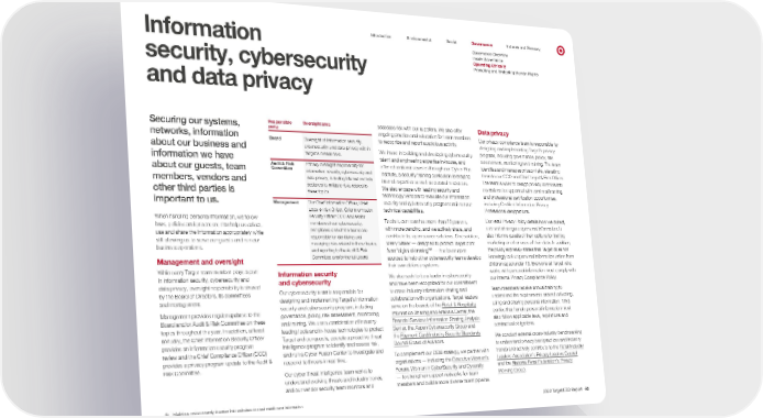 0 Introduction Environmental Social Governance Indexes and Glossary Governance Overview Information security, cybersecurity and data privacy Inside Governance Operating Ethically Promoting and Protecting Human Rights Securing our systems, networks, information about our business and information we have about our guests, team members, vendors and other third parties is important to us. When handling personal information, we follow laws, policies and processes that help us collect, use and share the information appropriately while still allowing us to serve our guests and run our business operations. Management and oversight While every Target team member plays a part in information security, cybersecurity and data privacy, oversight responsibility is shared by the Board of Directors, its committees and management. Management provides regular updates to the Board and/or Audit & Risk Committee on these topics throughout the year. In addition, at least annually, the Chief Information Security Officer provides an information security program review and the Chief Compliance Officer (CCO) provides a privacy program update to the Audit & Risk Committee. Responsible party Oversight area Board Oversight of information security, cybersecurity and data privacy within Target’s overall risks. Audit & Risk Committee Primary oversight responsibility for information security, cybersecurity and data privacy, including internal controls designed to mitigate risks related to these topics. Management Our Chief Information Officer, Chief Legal & Risk Officer, Chief Information Security Officer, CCO and senior members of our cybersecurity, compliance and ethics teams are responsible for identifying and managing risks related to these topics, and reporting to the Audit & Risk Committee and/or the full Board. Information security and cybersecurity Our cybersecurity team is responsible for designing and implementing Target’s information security and cybersecurity program, including governance, policy, risk assessment, monitoring and training. We use a combination of industry- leading tools and in-house technologies to protect Target and our guests, operate a proactive threat intelligence program to identify and assess risk, and run a Cyber Fusion Center to investigate and respond to threats in real time. Our cyber threat intelligence team works to understand evolving threats and industry trends, and our vendor security team monitors and assesses risk with our suppliers. We also offer ongoing practice and education for team members to recognize and report suspicious activity. We invest in building and developing cybersecurity talent and engineering expertise in-house, and offer educational courses through our Cyber Plus Institute, a security training curriculum leveraging internal expertise as well as curated resources. We also engage with leading security and technology vendors to evaluate our information security and cybersecurity program and test our technical capabilities. To date, our team has more than 20 patents, with more pending, and we actively share, and contribute to, open source solutions. One solution, Merry Maker — designed to protect Target.com from “digital skimming” 61 — has been open sourced to help other cybersecurity teams develop their own defense systems. We also seek to be a leader in cybersecurity and have been recognized for our commitment to cross-industry information sharing and collaboration with organizations. Target leaders serve on the boards of the Retail & Hospitality Information Sharing and Analysis Center , the Financial Services Information Sharing Analysis Center , the Aspen Cybersecurity Group and the Payment Card Industry Security Standards Council Board of Advisors. To complement our DE&I strategy, we partner with organizations — including the Executive Women’s Forum , Women in CyberSecurity and Cyversity — to strengthen support networks for team members and build a more diverse talent pipeline. Data privacy Our privacy compliance team is responsible for designing and implementing Target’s privacy program, including governance, policy, risk assessment, monitoring and training. The team identifies and manages privacy risks, elevating them to our CCO and Chief Legal & Risk Officer. The team’s work to design privacy controls into operations is supported with continual learning and professional certification opportunities, including Certified Information Privacy Professional designations. Our retail Privacy Policy details how we collect, use and share guest personal information. It also informs guests of their options for limiting marketing or other uses of their data. In addition, the policy expressly states that Target does not knowingly collect personal information online from children aged under 13. Everyone at Target who works with personal information must comply with our internal Privacy Compliance Policy. Team members receive annual training to understand the requirements around collecting, using and sharing personal information. Third parties that handle personal information must also follow applicable laws, regulations and contractual obligations. We conduct external cross-industry benchmarking to understand privacy best practices and industry trends and actively contribute to the Retail Industry Leaders Association’s Privacy Leaders Council and the National Retail Federation’s Privacy Working Group . 61 Malicious code covertly inserted into websites to steal credit card information. 2022 Target ESG Report 60