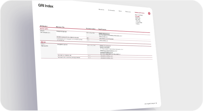 0 Introduction Environmental Social Governance Indexes and Glossary GRI Index About This Report GRI Index SASB Index SDG Index TCFD Index UNGPRF Index Glossary GRI Standard Disclosure Title Disclosure Number Target Response Anti-Corruption GRI 205: Anti-Corruption 2016 Management approach 103-1, 103-2, 103-3 Managing ESG issues p. 56 2022 Proxy Statement: Core functions of the Board p. 13–17 Ethical business p. 57 Operations assessed for risks related to corruption 205-1 Code of Ethics p. 23 and throughout Communication and training about anti-corruption policies and procedures 205-2 Ethical business p. 57 Materials GRI 301: Materials 2016 Management approach 103-1, 103-2, 103-3 Managing ESG issues p. 56 Materials & Deforestation 2022 Proxy Statement: Core functions of the Board p. 13–17 Responsibly sourced commodities p. 25–26 Investing in Circularity p. 15–18 Governance & Sustainability Committee Charter p. 1 Recycled input materials used 301-2 Investing in Circularity p. 15–18 Reclaimed products and their packaging materials 301-3 Investing in Circularity p. 15–18 2022 Target ESG Report 72