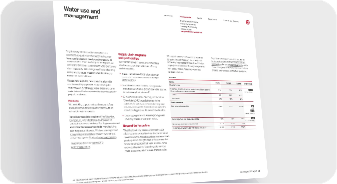 0 - - Introduction Environmental Social Governance Indexes and Glossary Water use and Environmental Overview Inside Environmental management Investing in Circularity Climate Action Responsible Resource Use Target closely monitors water use across our operations to quickly identify properties that may have possible leaks or need plumbing repairs. At many locations where landscapes are irrigated, we use HydroPoint smart controllers to water plants only when necessary, find underground leaks when they occur, and to pause irrigation when it’s raining or rainfall has been sufficient. We are now exploring new goals that align with our stewardship approach. As we develop the next phase of our strategy, water stress and other water risks will be incorporated to determine priority projects and areas. Products We are taking steps to reduce the impact of our product portfolio and production techniques on vulnerable water resources. Target is an associate member of The Microfibre Consortium , which facilitates development of practical solutions to minimize fiber fragmentation and environmental releases from textile manufacturing and the product life cycle. We have also supported OceanWise microplastics research by funding a cohort through the Outdoor Industry Association . Read more about our approach to water management . Supply chain programs and partnerships We maintain several initiatives and partnerships to enhance supply chain water use efficiency and stewardship. • In 2021, an estimated 20.9 billion gallons of water were saved thanks to our sourcing of Better Cotton . 44 • In addition to climate benefits, our regenerative agriculture work aims to protect local water sources by reducing agricultural run-off. • Our work with the Zero Discharge of Hazardous Chemicals (ZDHC) organization sets higher standards for factory wastewater discharge and reduces the presence of harmful chemicals in the manufacturing process for owned brand textiles. • Ongoing programs with Aii are improving water efficiency in home and apparel textiles. Beyond the fence line We strive to not only make a difference in water efficiency and stewardship of our direct and indirect operations, but to move beyond our own fence line to positively impact and give back to the communities where we extract from their water sources. As we evolve our beyond the fence line goals, we have made a concerted effort to make changes today. We support communities’ access to water and sanitation through Water.org . As of 2021, this partnership has resulted in more than 1.3 million people (88% of whom are female) being reached with lasting, reliable, household water and sanitation solutions. Water use Beyond our direct operations fence line, we are hard at work understanding and participating in community water projects across California , which is one of our greatest markets and also one of our greatest water-stressed areas of our operations. Metric FY2021 FY2020 FY2019 Framework Manufacturing Percentage of SKUs of garment-washed owned brand apparel utilizing water-saving design principles 57% 74% 49% CG-AA-430a.1 Denim 84% 95% 61% Non-denim 40% 53% 42% SASB Direct operations Total water withdrawn (ML) 11,399 10,571 10,986 303-3 CG-HP-140a.1(1) Percentage from municipal water utilities Percentage from water-stressed areas >99% 37.4% >99% 37.6% >99% CG-HP-140a.1(2) N/A Percentage change in water withdrawal since 2010 -11.3% -17.7% -14.5% GRI SASB SASB 44 BCI supports farmers in water efficiency to consume and pollute less water, thus achieving greater yields and building resilience to climate change while promoting the fair use and allocation of water resources among users beyond the farm, up to the watershed level. 2022 Target ESG Report 29