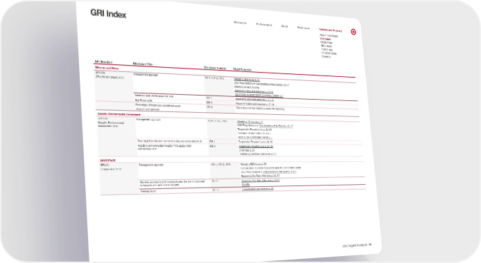 0 Introduction Environmental Social Governance Indexes and Glossary GRI Index About This Report GRI Index SASB Index SDG Index TCFD Index UNGPRF Index Glossary GRI Standard Disclosure Title Disclosure Number Target Response Effluents and Waste GRI 306: Effluents and W aste 2016 Management approach 103-1, 103-2, 103-3 Managing ESG issues p. 56 2022 Proxy Statement: Core functions of the Board p. 13–17 Waste & Circular Economy Waste elimination and reduction p. 17–18 Governance & Sustainability Committee Charter p. 1 Waste by type and disposal method 306-2 Waste elimination and reduction p. 17–18 Significant spills 306-3 Waste elimination and reduction p. 17–18 Percentage of hazardous operational waste shipped int ernationally 306-4 Target does not ship hazardous waste internationally. Supplier Environmental Assessment GRI 308: Supplier Envir onmental Assessment 2016 Management approach 103-1, 103-2, 103-3 Managing ESG issues p. 56 2022 Proxy Statement: Core functions of the Board p. 13–17 Responsible Resource Use p. 24–30 Business Partner Code of Conduct Audit & Risk Committee Charter p. 1 New suppliers that were screened using environmental criteria 308-1 Responsible Resource Use p. 24–30 Negative environmental impacts in the supply chain and actions tak en 308-2 Responsible Resource Use p. 24–30 Chemicals p. 30 Purchasing practices: Grievances p. 58 Employment GRI 401: Employment 2016 Management approach 103-1, 103-2, 103-3 Managing ESG issues p. 56 Compensation & Human Capital Management Committee Charter 2022 Proxy Statement: Core functions of the Board p. 13–17 Supporting Our Team Members p. 34–35 Benefits provided to full-time employees that are not provided t o temporary or part-time employees 401-2 Supporting Our Team Members p. 34–35 Benefits Parental leave 401-3 Compensation and benefits p. 36 2022 Target ESG Report 79