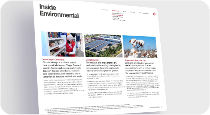 0 Net zero Introduction Environmental Social Governance Indexes and Glossary Environmental Overview Inside Environmental Inside Environmental Investing in Circularity Climate Action Responsible Resource Use Investing in Circularity Circular design is a critical part of how we will deliver our Target Forward goal to design and elevate sustainable brands 9 that are affordable, inclusive and inspirational, and essential to our ambition to innovate to eliminate waste. We are partnering across our supply chain to design solutions within our products, packaging and operations that use fewer materials, remain in use longer, and make reuse and recycling easier, while continuing to provide ease and convenience for our guests. Our inclusive design approach, Design for All , supports our evolution toward circularity and maintains our focus on providing joyful experiences for our guests. Climate Action The impacts of climate change are profound and increasingly being felt by people across the world, particularly society’s most marginalized groups. As a trusted, leading brand, Target knows that urgent action is needed. That’s why we have committed to being a net zero enterprise 10 by 2040. To meet the challenge of climate change, we’re increasing energy efficiency, using more renewable energy and implementing new practices across our value chain to reduce our carbon footprint. We are also using scenario analysis as a tool to assess the potential implications of climate-related risks. By collaborating with key partners across our value chain and joining climate coalitions, we are accelerating decarbonization at an industrywide scale. Responsible Resource Use Our planet provides the raw materials needed for our products. It is our responsibility to work to protect nature, the people who produce materials and the communities in which they live. Because many impacts associated with our products originate in our supply chains, we collaborate with suppliers to create shared positive impact and enhance transparency, leveraging our internal policies to uphold robust raw material sourcing standards. We have commitments for the responsible sourcing of forest products , chemicals , cotton , animal welfare , palm oil and seafood , with efforts aimed at nurturing biodiversity, advancing water stewardship and driving best practices in chemicals use. Our diligence to source responsibly is part of our Target Forward commitment to fostering a sustainable and inclusive supply chain that is just and equitable for all workers. 9 Brands or manufacturers with industry-leading products or services that have context-specific environmental and/or socially beneficial features, backed by credible standards or impact metrics. 10 , as defined, is achieved when a company’s scope 1, 2 and 3 emissions are reduced to a level that is consistent with a 1.5°C pathway, and any residual emissions are removed from the atmosphere through either nature- based or technological carbon removal solutions (e.g., forestry, regenerative agriculture, carbon capture technology), by no later than 2050. Target has committed to being a net zero enterprise by 2040 — zero waste to landfill in U.S. operations and net zero emissions across both our operations and supply chain, inclusive of scopes 1, 2 and 3. 2022 Target ESG Report 14