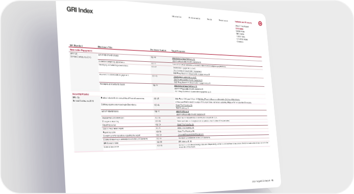 0 Introduction Environmental Social Governance Indexes and Glossary GRI Index About This Report GRI Index SASB Index SDG Index TCFD Index UNGPRF Index Glossary GRI Standard Disclosure Title Disclosure Number Target Response Stakeholder Engagement GRI 102: General Disclosures 2016 List of stakeholder groups 102-40 Stakeholder Engagement p. 9–10 ESG Priorities & Stakeholder Engagement Collective bargaining agreements 102-41 None of our active workforce is covered under collective bargaining agreements. Identifying and selecting stakeholders 102-42 Stakeholder Engagement p. 9–10 ESG Priorities & Stakeholder Engagement 2022 Proxy Statement: Shareholder engagement p.18 Approach to stakeholder engagement 102-43 Stakeholder Engagement p. 9–10 ESG Priorities & Stakeholder Engagement 2022 Proxy Statement: Shareholder engagement p.18 Key topics and concerns raised 102-44 Stakeholder Engagement p. 9–10 ESG Priorities & Stakeholder Engagement 2022 Proxy Statement: Shareholder engagement p.18 Reporting Practice GRI 102: General Disclosures 2016 Entities included in the consolidated financial statements 102-45 2021 Form 10-K: part IV: Item 15. Exhibits, Financial Statement Schedules (21) List of Subsidiaries Unless specifically noted, the scope of this report does not include subsidiary Shipt, or former subsidiary Dermstore. Defining report content and topic Boundaries 102-46 About This Report p. 66 ESG Priorities p. 8 List of material topics 102-47 ESG Priorities p. 8 ESG Priorities & Stakeholder Engagement Restatements of information 102-48 Target has no restatements of information to report for 2021. Changes in reporting 102-49 There have been no changes since our previous report unless otherwise noted. Reporting period 102-50 About This Report p. 66 Date of most recent report 102-51 About This Report p. 66 Reporting cycle 102-52 About This Report p. 66 Contact point for questions regarding the report 102-53 CorporateResponsibility@Target.com Claims of reporting in accordance with the GRI Standards 102-54 The report is in reference to the GRI Standards. GRI Content Index 102-55 GRI Index p. 67–83 External assurance 102-56 Some of our climate and energy data are independently verified to a limited level of assurance. We did not seek external assurance for the remainder of this report. 2022 Target ESG Report 70