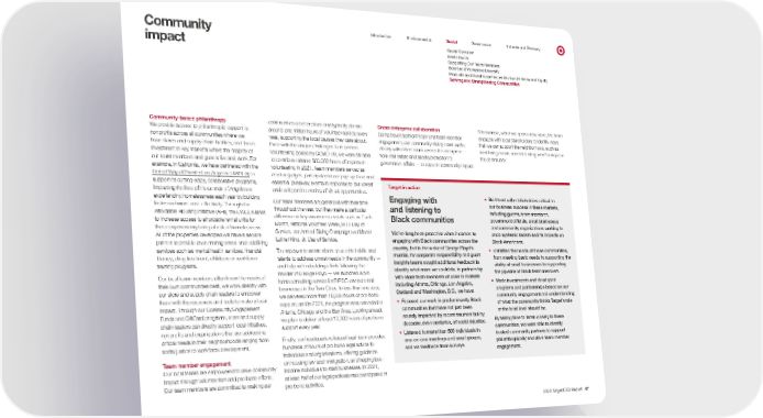 0 Introduction Environmental Social Governance Indexes and Glossary Community Social Overview Inside Social impact Supporting Our Team Members Board and Workplace Diversity Products and Guest Experiences Built on Fairness and Equity Serving and Strengthening Communities Community-based philanthropy We provide access to philanthropic support to nonprofits across all communities where we have stores and supply chain facilities, and focus investment in key markets where the majority of our team members and guests live and work. For example, in California, we have partnered with the United Way of Greater Los Angeles (UWGLA) to support its cutting-edge, collaborative programs, impacting the lives of thousands of Angelenos experiencing homelessness each year by building faster and more cost-effectively. Through the Affordable Housing Initiative (AHI), the UWGLA aims to increase access to affordable rental units for those experiencing being at risk of homelessness. All of the properties developed will have a service partner to provide case management and stabilizing services such as mental health services, financial literacy, drug treatment, childcare or workforce training programs. Our local team members often know the needs of their own communities best; we work directly with our store and supply chain leaders to empower them with the resources and tools to make a local impact. Through our Community Engagement Funds and GiftCard programs, store and supply chain leaders can directly support local initiatives, nonprofits and organizations that are addressing critical needs in their neighborhoods ranging from social justice to workforce development. Team member engagement Our local teams are empowered to drive community impact through volunteerism and pro bono efforts. Our team members are committed to making our communities a better place and typically donate around one million hours of volunteer service every year, supporting the local causes they care about. Even with the unique challenges to in-person volunteering posed by COVID-19, we were still able to contribute almost 900,000 hours of in-person volunteering in 2021. Team members served as election judges, participated in our pop-up food and essential giveaway events in response to civil unrest and took part in a variety of virtual opportunities. Our team members are generous with their time throughout the year, but they make a particular difference at key awareness events such as Earth Month, National Volunteer Week, 9/11 Day of Service, our Annual Giving Campaign and Martin Luther King, Jr. Day of Service. To empower team members to use their skills and talents to address unmet needs in the community — and help with rebuilding efforts following the murder of George Floyd — we launched a pro bono consulting service for BIPOC-owned small businesses in the Twin Cities. In less than one year, we delivered more than 10,000 hours of pro bono support, and in 2021, the program was extended to Atlanta, Chicago and the Bay Area. Looking ahead, we plan to deliver at least 10,000 hours of pro bono support every year. Finally, our headquarters-based legal team provides hundreds of hours of pro bono legal advice to individuals and organizations, offering guidance on housing law and immigration, and helping low- income individuals to start businesses. In 2021, at least half of our legal professionals participated in pro bono activities. Cross-enterprise collaboration Going beyond philanthropy and team member engagement, our community vitality team works closely with other teams across the enterprise — from real estate and assets protection to government affairs — to support community impact. Target in action Engaging with and listening to Black communities We’ve long been proactive when it comes to engaging with Black communities across the country, but in the wake of George Floyd’s murder, the corporate responsibility and guest insights teams sought additional feedback to identify what more we could do. In partnership with store team members of color in markets including Atlanta, Chicago, Los Angeles, Oakland and Washington, D.C., we have: • Focused our work in predominantly Black communities that have not just been acutely impacted by recent traumas but by decades, even centuries, of social injustice. • Listened to more than 500 individuals in one-on-one meetings and small groups, and via feedback from surveys. For example, when we open a new store, the team engages with local stakeholders to identify ways that we can support the neighborhood, such as local hiring events and celebrating what’s unique in the community. • Built trust with stakeholders critical to our business success in these markets, including guests, team members, government officials, small businesses and community organizations working to undo systemic racism and its impacts on Black Americans. • Identified the needs of these communities, from meeting basic needs to supporting the vitality of small businesses to supporting the pipeline of Black team members. • Made investments and developed programs and partnerships based on our community engagement and understanding of what the community thinks Target’s role at the local level should be. By taking time to listen closely to these communities, we were able to identify trusted community partners to support philanthropically and drive team member engagement. 2022 Target ESG Report 47