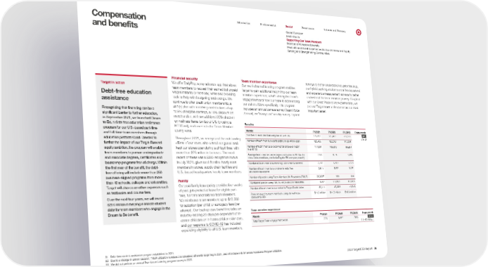 0 - Introduction Environmental Social Governance Indexes and Glossary Compensation and benefits Social Overview Inside Social Supporting Our Team Members Board and Workplace Diversity Products and Guest Experiences Built on Fairness and Equity Serving and Strengthening Communities Target in action Debt-free education assistance Recognizing that financing can be a significant barrier to further education, in September 2021, we launched Dream to Be, a debt-free education assistance program for our U.S.-based part-time and full-time team members through education platform Guild . Created to further the impact of our Target Forward equity ambition, the program will enable team members to pursue undergraduate and associate degrees, certificates and bootcamp programs free of charge. Within the first year of the benefit, the debt- free offering will include more than 250 business-aligned programs from more than 40 schools, colleges and universities. Target will also cover other expenses such as textbooks and course fees. Over the next four years, we will invest $200 million in helping eliminate student debt for team members who engage in the Dream to Be benefit. Financial security Team member experience surveys to better understand key priorities (e.g., our hybrid working environment at headquarters) and experience measurement surveys to better understand the team member journey. Coupled with our Great Place to Work partnership, we put our Target team at the center as our most important asset. We offer DailyPay, a pay advance app that allows team members to request their earned but unpaid wages instantly or next day, while also providing tools to help with budgeting and savings. We continue to offer credit union membership, a 401(k) plan with matching contributions of up to 5% of eligible earnings, a 10% discount on merchandise, with an additional 20% discount on wellness items (on top of 5% for using a REDCard), and access to the Team Member Giving Fund. Our multi-channel listening program enables Target to gain additional insight into our team member experience, what’s driving the team’s engagement and how our team is experiencing our culture. More specifically, this program includes an annual census survey (Team Voice Annual), an “always on” weekly survey, topical Benefits Metric FY2021 FY2020 FY2019 Framework Number of team members eligible for a 401(k) 270,453 258,983 228,375 GRI 401-2 Number of team members participating in our 401(k) plan 129,458 122,903 115,384 Throughout 2021, we recognized the outstanding efforts of our team, who served our guests and kept our stores open during a difficult time, with more than $75 million in bonuses. The most recent of these was a $200 recognition bonus in July 2021, given to all frontline hourly team members in stores, supply chain facilities and U.S.-based headquarters hourly team members. Number of team members receiving full employer match in a 401(k) 117,034 103,000 88,234 Average team member percentage contribution to 401(k)s (for those who contribute, not including the 5% company match) 7.5% 6.1% 5.9% Number of team members receiving tuition reimbursement 2,142 1,783 1,823 Number of team members enrolled in debt-free education assistance 2,611 N/A 51 N/A 51 Number of people using Team Member Life Resources (TMLR) 29,833 52 N/A N/A Family Number of people using TMLR and Onsite Life Resources N/A 52 111,583 108,986 Our paid family leave policy provides four weeks of paid, job-protected leave for eligible part- time, full-time and salaried team members. We reimburse team members up to $10,000 for adoption (per child) or surrogacy fees (per attempt). Our backup care benefit includes an industry-leading 20 days per dependent of in- center childcare or in-home child or elder care, and Number of team members enrolled in Target Credit Union 20,111 20,328 19,616 Amount saved by team members using our wellness discount (USD) $11.3 million $11.5 million $10.6 million Team member experience Metric FY2021 FY2020 FY2019 Framework Total Target Team engagement score 77% N/A 53 76% our response to COVID-19 has included expanding eligibility to all U.S. team members. SASB CG-EC-330a.1 51 Debt-free student assistance program established in 2021. 52 Due to a change in vendor support, TMLR utilization numbers are calculated differently beginning in 2021, and will include only Employee Assistance Program utilization. 53 We did not perform an annual TeamVoice Listening program survey in 2020. 2022 Target ESG Report 36