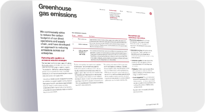 0 Introduction Environmental Social Governance Indexes and Glossary Environmental Overview Greenhouse gas emissions Inside Environmental Investing in Circularity Climate Action Responsible Resource Use We continuously strive to reduce the carbon footprint of our direct operations and supply chain, and have developed an approach to reducing emissions across our enterprise. Partnering with suppliers on emissions reduction strategies We have been working for many years with various third-party partners on initiatives to reduce scope 3 emissions and track progress against our goals. The production, distribution, use and disposal of products are responsible for most of our GHG emissions, so we have set several targets to reduce emissions across our supply chain. Through our climate supplier engagement program, we continue to support suppliers as they calculate their carbon footprint, set science-based emission reduction targets, track progress and drive collaborative action. Around 32% of our top 80% of suppliers by spend had set emissions reduction targets by end of 2021. Our emissions impacts Scope Definition Our impact 1 Direct emissions Target operates a variety of stores, offices, supply chain facilities, data centers and off-site warehouses. These sites create direct emissions through the activities under their control. They also consume electricity, which generates indirect emissions during its production. Together, scope 1 and 2 emissions account for approximately 3% of our emissions footprint. 2 Indirect emissions 3 Indirect emissions (upstream and downstream value chain) Our upstream and downstream value chain activities cover manufacturing, product distribution, business travel, guests using our products and other indirect sources. These types of indirect emissions account for around 97% of our GHG emissions. Specifically, goods and services that we purchase account for approximately 47% of our scope 3 emissions, and the remaining 53% of scope 3 emissions come from use of sold products, transportation and other activities. To date, our suppliers have reported net reductions in their scope 1 and 2 emissions equivalent to 5.3% of the baseline established in 2017. We use the Higg Facility Environmental Module (FEM) and CDP to capture allocated emissions reductions from our suppliers, and these reductions were reported from third-party verified datasets or were validated internally by Target. In 2020, the number of suppliers reporting on their 2019 reductions increased by over 70%. Our suppliers are in the process of completing their 2021 data submissions. The business environment in 2021 impacted our growth and therefore our emissions. Total sales increased by $12.2 billion, from $92.4 billion in 2020 to $104.61 billion in 2021, which contributed to a 4.5% rise year-over-year in scope 3 emissions. As we work on our ambitious climate goals and partner with our suppliers to make reductions, we expect to see those efforts reflected in our future emissions performance over the medium and long term. Key upstream and downstream interventions • Regenerative agriculture: We co-funded a five-year, $8.5 million project with Cargill, McDonald’s and the U.S. Department of Agriculture to help Nebraska farmers advance soil health. • Responsible sourcing: With multiple partners and stakeholders, Target is working to meet responsible sourcing and climate change commitments for palm oil, forest products, cotton, coffee and seafood. • Sustainable logistics: We seek opportunities to work with third-party logistics providers to improve the efficiency with which they move our products. • Packaging: In 2020, we announced ambitious 2025 commitments to eliminate problematic plastics in packaging with the potential to reduce energy use and GHG emissions. • Guest engagement: The use of sold products accounts for approximately 35% of our scope 3 carbon emissions — we have an opportunity to educate our guests on reducing emissions, such as through the purchase of ENERGY STAR- certified products. Read more about our investments into supply chain improvements . 2022 Target ESG Report 20