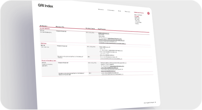 0 Introduction Environmental Social Governance Indexes and Glossary GRI Index About This Report GRI Index SASB Index SDG Index TCFD Index UNGPRF Index Glossary GRI Standard Disclosure Title Disclosure Number Target Response Non-discrimination GRI 406: Non-discrimination 2016 Management approach 103-1, 103-2, 103-3 Managing ESG issues p. 56 Code of Ethics Ethics at Target 2022 Proxy Statement: Core functions of the Board p. 13–17 Purchasing practices: Social responsibility in the supply chain p. 58 Workplace diversity: Non-discrimination p. 39 Compensation & Human Capital Management Committee Charter p. 2 Child Labor GRI 408: Child Labor 2016 Management approach Operations and suppliers at significant risk for incidents of child labor 103-1, 103-2, 103-3 408-1 Managing ESG issues p. 56 Code of Ethics 2022 Proxy Statement: Core functions of the Board p. 13–17 Human rights: Combating forced labor p. 63 Human rights p. 63–64 Audit & Risk Committee Charter p. 5 Human rights: Combating forced labor p. 63 Human rights: Audits and continuous improvement p. 64 Forced or Compulsory Labor GRI 409: F orced or Compulsory Labor 2016 Management approach Operations and suppliers at significant risk for incidents of for ced or compulsory labor 103-1, 103-2, 103-3 409-1 Purchasing practices: Social responsibility in the supply chain p. 58 Standards of Vendor Engagement 2022 Proxy Statement: Core functions of the Board p. 13–17 Human rights: Combating forced labor p. 63 Human rights: Audits and continuous improvement p. 64 Audit & Risk Committee Charter p. 5 Human rights: Combating forced labor p. 63 Human rights: Audits and continuous improvement p. 64 2022 Target ESG Report 81