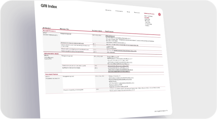 0 Introduction Environmental Social Governance Indexes and Glossary GRI Index About This Report GRI Index SASB Index SDG Index TCFD Index UNGPRF Index Glossary GRI Standard Disclosure Title Disclosure Number Target Response Economic Performance GRI 201 Economic P erformance 2016 Management approach 103-1, 103-2, 103-3 Ethical business p. 57 2022 Proxy Statement: Core functions of the Board p. 13–17 2021 Form 10-K: part II. Item 7. Management’s Discussion and Analysis of Financial Condition and Results of Operations; part I. Item 1A. Risk Factors Infrastructure & Finance Committee Charter p. 1 Direct economic value generated and distributed 201-1 2021 Form 10-K: part II. Item 8. Financial Statements and Supplementary Data. Financial implications and other risks and opportunities due to climat e change 201-2 Climate & Energy CDP Climate Response Defined benefit plan obligations and other retirement plans 201-3 2021 Form 10-K: Defined Contribution Plans and Pension Plans p. 58–62 Financial assistance received from government 201-4 Data is unavailable. Indirect Economic Impacts GRI 203: Indir ect Economic Impacts 2016 Management approach 103-1, 103-2, 103-3 Managing ESG issues p. 56 2022 Proxy Statement: Core functions of the Board p. 13–17 Serving and Strengthening Communities p. 46–49 Elevating equity in supply chains and communities p. 51–52 Governance & Sustainability Committee Charter p. 1 Infrastructure investments and services supported 203-1 Serving and Strengthening Communities p. 46–49 Significant indirect economic impacts 203-2 Serving and Strengthening Communities p. 46–49 Elevating equity in supply chains and communities p. 51–52 Governance & Sustainability Committee Charter p. 1 Procurement Practices GRI 204: P rocurement Practices 2016 Management approach 103-1, 103-2, 103-3 Managing ESG issues p. 56 Elevating equity in supply chains and communities p. 51–52 Responsible Sourcing and Sustainability audit program Supplier Diversity 2022 Proxy Statement: Core functions of the Board p. 13–17 Purchasing practices p. 58–59 Responsibly sourced commodities p. 25–26 Proportion of spending on local suppliers 204-1 5.0% of our procurement came from Minnesota and three counties in Western Wisconsin (Polk, St. Croix and Pierce counties). Elevating equity in supply chains and communities p. 51–52 2022 Target ESG Report 71
