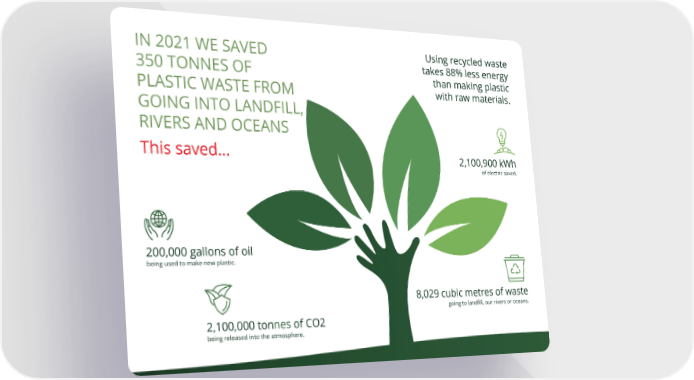 Using recycled waste IN 2021 WE SAVED takes 88% less energy 350 TONNES OF than making plastic PLASTIC WASTE FROM with raw materials. GOING INTO LANDFILL, RIVERS AND OCEANS This saved... 2,100,900 kWh of electric saved. 200,000 gallons of oil being used to make new plastic. 8,029 cubic metres of waste going to land昀椀ll, our rivers or oceans. 2,100,000 tonnes of CO2 being released into the atmosphere.