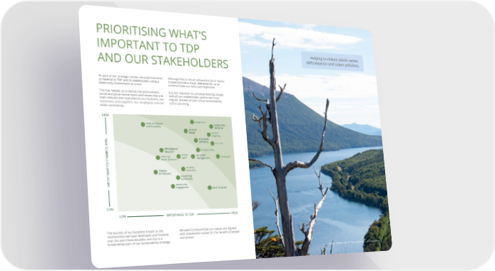 PRIORITISING WHAT'S IMPORTANT TO TDP Helping to reduce plastic waste, AND OUR STAKEHOLDERS deforestation and ocean pollution. As part of our strategic review, we explored what Although this is not an exhaustive list of topics, is material to TDP and its stakeholders using a it does provide a visual reference for us to Materiality Assessment as a tool. communicate our aims and objectives. This has helped us to de昀椀ne the environment, It is our intention to continue working closely social and governance topics and issues that are with all our stakeholders and to carry out both relevant and important to our business, our regular reviews as part of our sustainability customers and suppliers, our employees and our action planning. wider community. HIGH compliance product lifecycle supply chain and durability resilience product design plastics recycling employee wellbeing net zero deforestation transportation reduction reducing human UK waste innovation ocean pollution rights management creating lifestyle memories enrichment supporting biodiversity IMPORTANCE TO STAKEHOLDERS community engagement vision & values LOW LOW IMPORTANCE TO TDP HIGH The success of our business is built on the We want to ensure that our values are aligned relationships we have developed and fostered with stakeholder values for the bene昀椀t of people over the past three decades, and this is a and planet. fundamental part of our sustainability strategy. Image: Hidden Lake in Tierra del Fuego – © Rob Barlow