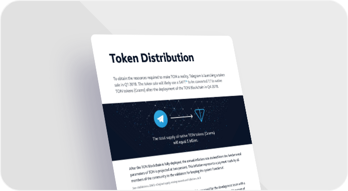 Token Distribution o obtain the resources re’uired to make ƒ„ a reality elegram is launching a token 10 sale in £ . he token sale will likely use a €”› to be converted – to native ƒ„ tokens …¢rams† after the deployment of the ƒ„ ˆlockchain in £— . he total supply of native ƒ„ tokens …¢rams† will e’ual ™ billion. ”fter the ƒ„ ˆlockchain is fully deployed the annual inflation rate derived from the fundamental parameters of ƒ„ is pro“ected at two percent. his inflation represents a payment made by all members of the community to the validators for keeping the system functional. ee «Šalidators», 2.6.1, «Original suppl, mining rewards and inflation», A.3 ›our percent of the supply … million ¢rams† will be reserved for the development team with a —-year vesting period. ‘uring the initial stage of active ƒ„ development at least ™ percent of the entire supply will be retained by the ƒ„ Reserve to protect the nascent cryptocurrency from speculative trading and to maintain fle‹ibility at the early stages of the evolution of the system. he remaining —— percent …. billion ¢rams† can be sold in accordance with the formula below– −• n p –¤ . × … ¦ † ¨€‘ n he price of the first token to be sold will be appro‹imately . ¨€‘ with and each successive token will be priced one billionth higher than the previous one. ”s a result the additional supply . €ee the €”› Pro“ect. Ÿ Ž Œ