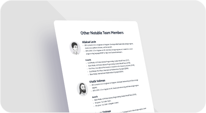 Other Notable Team MemberŠ liaksei evin › Œ-present– CŽC¦¦ Engineer at elegram. ‘eveloped distributed data storage engines client cross-platform libraries and the bot ”PI® › - Œ– CŽC¦¦ Engineer at ž¯. ˆuilt data storage engines and created the custom programming language ¯PP for high-level backend developers. A“ar‡Š › ¢old Medal ”CM International Programming Contest ˜orld ›inals … †® › €ilver Medal ”CM International Programming Contest ˜orld ›inals … †® › ›irst Pri‡e International Mathematics Competition for ¨niversity €tudents …•†® › ¢old Medal ›irst Place International Mathematical ƒlympiad …™†® › €ilver Medal International Mathematical ƒlympiad …—†. italik altman › Œ-present– CŽC¦¦ Engineer at elegram. ‘eveloped networking and data storage engines® › - Œ– CŽC¦¦ Engineer at ž¯. ‘eveloped networking and data storage engines. A“ar‡Š › €ilver Medal ”CM International Programming Contest ˜orld ›inals …Ÿ†® › —th place op Coder ƒpen® › —th place op Coder Collegiate Contest. rsen mirnov › Œ-present– CŽC¦¦ Engineer at elegram. ‘eveloped server data storage engines client cross-platform libraries and bot ”PI® › - Œ– CŽC¦¦ Engineer at ž¯. ‘eveloped data storage engines and created the custom programming language ¯PP for high-level backend developers. A“ar‡Š › ¢old Medal ”CM International Programming Contest ˜orld ›inals … †® › €ilver Medal ”CM International Programming Contest ˜orld ›inals … †. Ž Œ