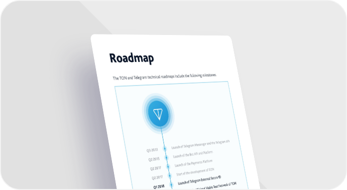 Roadmap he ƒ„ and elegram technical roadmaps include the following milestones– aunch of elegram Messenger and the elegram ”PI aunch of the ˆot ”PI and Platform aunch of the Payments Platform €tart of the development of ƒ„ € aunch of elegram E‹ternal €ecure I‘ € aunch of the Minimal žiable est „etwork of ƒ„ € esting and security audits of ƒ„ ‚ € ‘eployment of the stable version of ƒ„ ‚ € aunch of elegram ˜allet ƒ Creation of ƒ„-based economy in elegram ƒ aunch of ƒ„ €ervices ƒ„ €torage and ƒ„ Pro‹y elegram will also continue shipping monthly product updates that are not related to ƒ„. ™ Ž Œ