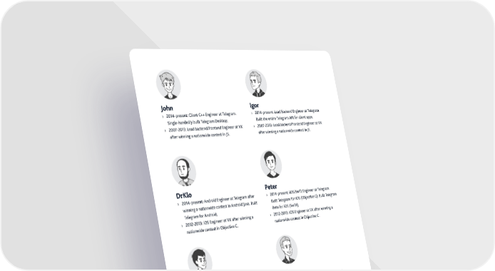 ‚o€n gor › —-present– Client C¦¦ Engineer at elegram. › —-present– ead ˆackend Engineer at elegram. €ingle-handedly built elegram ‘esktop® ˆuilt the entire elegram ”PI for client apps® › š- Œ– ead backendŽfrontend Engineer at ž¯ › š- Œ– ead backendŽfrontend Engineer at ž¯ after winning a nationwide contest in «€. after winning a nationwide contest in «€. Drlo Peter › —-present– ”ndroid Engineer at elegram after › —-present– iƒ€Ž€wift Engineer at elegram. winning a nationwide contest in ”ndroid «ava. ˆuilt ˆuilt elegram for iƒ€ …ƒb“ective C†. ˆuilt elegram elegram for ”ndroid® ˆeta for iƒ€ …€wift†® › - Œ– iƒ€ Engineer at ž¯ after winning a › - Œ– iƒ€ Engineer at ž¯ after winning a nationwide contest in ƒb“ective C. nationwide contest in ƒb“ective C. ris€a olar › Ÿ-present– Cross Platform ‘eveloper › —-present– ˆackendŽ›rontend Engineer at at elegram. ˆuilds voice calls® elegram. ˆuilt the Instant žiew Platform the › - Ÿ– ”ndroid Engineer at ž¯ after winning ranslations Platform telegra.ph telesco.pe etc.® a nationwide contest in «ava for ”ndroid. €ingle- › - Œ– ead backendŽfrontend Engineer at ž¯ handedly built the ž¯ app for ”ndroid. after winning a nationwide contest in «€. la gor › Œ-present– iƒ€Ž€wift Engineer at elegram after › Œ-present– Infrastructure ”rchitect at elegram. several winning a nationwide contest in ƒb“ective €caled elegram to tens of thousands of servers® C. ˆuilt multiple features for elegram iƒ€. › - Œ– €enior €ystem Engineer. €caled ž¯ to tens of thousands of servers. Œ Ž Œ