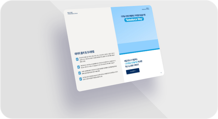 What is CRM? Episode 1. 고객�중심�디지털�혁신�시크릿�노트 초개인화�시대, '유난' 기업의�성공 디지털�시대에�차별화된�고객경험�제공을�위한 ‘Salesforce Way’ 데이터�출처�및�조사방법 본�보고서에�인용된�모든�데이터는�영업, 마케팅, 서비스, 커머스/온라인, 경영지원, 인사/총무, IT 부서에 소속되어�있고�디지털�혁신과�관련된�의사결정에�영향력을�미치는 �,���명�이상의�전문가들의�설문조사 응답에�기반�함 해당�연구조사는 Third-Party 조사�응답자를�대상으로�한�설문조사�데이터를�기반으로�구성되었으며, 모든 응답자는�대한민국에�거주하는�내국인으로, ��개�이상의�산업군에�종사하는�전문가들을�대상으로�함 세일즈포스가�제공하는 이커머스�및�마케팅�부문의�디지털�혁신의�가속화로�인해, 해당�직군에�해당하는�전문가들을�대상으로�해당 ʻ고객�중심�디지털�혁신’에�대한 영역의�심층조사를�위한�별도의�연구조사를�진행�함 최신�뉴스레터�구독하기 본�연구조사�결과의�공개�범위는�본�보고서에�명시된�데이터로�그�범위를�한정하며, 국내�전문조사�기관과의 협의에�기초하여�각�응답자의�개인정보보호를�우선시�함 구독�신청하기 38
