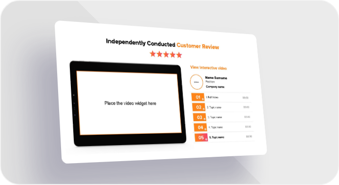 Independently Conducted Customer Review View Interactive video Name Surname Position picture Company name 1. Full Video 00:00 01 Place the video widget here 2. Topic name 00:00 02 3. Topic name 00:00 03 4. Topic name 00:00 04 5. Topic name 00:00 05