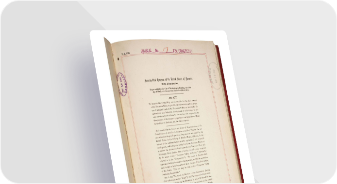 Tennessee Valley Authority Act (1933)This act created the Tennessee Valley Authority to oversee the construction of dams to control flooding, navigation, and create cheap electric power. OriginalPhotoTranscript