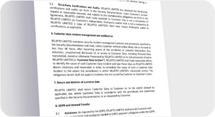 appropriate technical and organizational measures to ensure a level of security appropriate to the risk posed by the Processing. RELAYTO LIMITED’s measures will include those set forth in the Security Documentation attached as Annex II to the SCC applicable to the DPA. RELAYTO LIMITED regularly monitors compliance with these measures. RELAYTO LIMITED will not materially decrease the overall security of the Services during a subscription term. 5.2 Third-Party Certifications and Audits. RELAYTO LIMITED has obtained the third-party certifications and audits set forth in the Security Documentation. Upon Customer’s written request at reasonable intervals, and subject to the confidentiality obligations set forth in the Agreement, RELAYTO LIMITED shall make available to Customer that is not a competitor of RELAYTO LIMITED (or Customer’s independent, third-party auditor that is not a competitor of RELAYTO LIMITED) a copy of RELAYTO LIMITED’s then most recent third-party audits or certifications, as applicable. 6. Customer data incident management and notification RELAYTO LIMITED maintains security incident management policies and procedures specified in the Security Documentation and shall, notify Customer without undue delay, but in no event in less than 48 hours, after becoming aware of the accidental or unlawful destruction, loss, alteration, unauthorized disclosure of, or access to Customer Data, including Personal Data, transmitted, stored or otherwise Processed by RELAYTO LIMITED or its Sub-processors of which RELAYTO LIMITED (a “Customer Data Incident”). RELAYTO LIMITED shall make reasonable efforts to identify the cause of such Customer Data Incident and take those steps as RELAYTO LIMITED deems necessary and reasonable in order to remediate the cause of such a Customer Data Incident to the extent the remediation is within RELAYTO LIMITED’s reasonable control. The obligations herein shall not apply to incidents that are caused by Customer or Customer’s Users. 7. Return and deletion of customer data RELAYTO LIMITED shall return Customer Data to Customer or, to the extent allowed by applicable law, delete Customer Data in accordance with the procedures and timeframes specified in the Security Documentation, or as requested by Customer. 8. GDPR and Onward Transfer 8.1 Assistance. As required by the GDPR, RELAYTO LIMITED shall provide Customer with reasonable cooperation and assistance needed to fulfill Customer’s obligation under the GDPR. 8.2 Standard Contractual Clauses. The Standard Contractual Clauses apply to any transfers of Personal Data under this DPA from the European Union, the European Economic Area and/or their member states, Switzerland and the United Kingdom to RELAYTO LIMITED’s facilities in countries which do not ensure an adequate level of data protection within the meaning of Data Protection Laws and Regulations, to the extent such transfers are subject to such Data 20 of 53