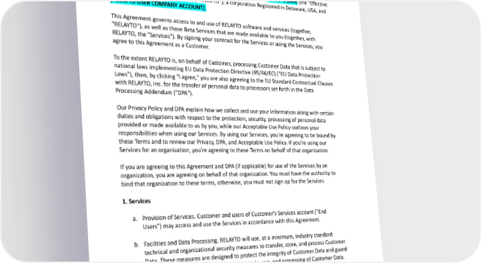 Agreement BUSINESS AGREEMENT FOR PAID ACCOUNTS This Business Agreement for Paid Accounts (“Agreement”) is made TODAY’S DATE (the “Effective Date”) between RELAYTO Limited, (“RELAYTO”), a corporation Registered in Delaware, USA, and [RELAYTO USER COMPANY ACCOUNT]. This Agreement governs access to and use of RELAYTO software and services (together, "RELAYTO''), as well as those Beta Services that are made available to you (together, with RELAYTO, the "Services"). By signing your contract for the Services or using the Services, you agree to this Agreement as a Customer. To the extent RELAYTO is, on behalf of Customer, processing Customer Data that is subject to national laws implementing EU Data Protection Directive (95/46/EC) ("EU Data Protection Laws"), then, by clicking "I agree," you are also agreeing to the EU Standard Contractual Clauses with RELAYTO, Inc. for the transfer of personal data to processors set forth in the Data Processing Addendum ("DPA"). Our Privacy Policy and DPA explain how we collect and use your information along with certain duties and obligations with respect to the protection, security, processing of personal data provided or made available to us by you, while our Acceptable Use Policy outlines your responsibilities when using our Services. By using our Services, you're agreeing to be bound by these Terms and to review our Privacy, DPA, and Acceptable Use Policy. If you're using our Services for an organization, you're agreeing to these Terms on behalf of that organization. If you are agreeing to this Agreement and DPA (if applicable) for use of the Services by an organization, you are agreeing on behalf of that organization. You must have the authority to bind that organization to these terms, otherwise, you must not sign up for the Services. 1. Services a. Provision of Services. Customer and users of Customer's Services account ("End Users") may access and use the Services in accordance with this Agreement. b. Facilities and Data Processing. RELAYTO will use, at a minimum, industry standard technical and organizational security measures to transfer, store, and process Customer Data. These measures are designed to protect the integrity of Customer Data and guard against the unauthorized or unlawful access to, use, and processing of Customer Data. Customer agrees that RELAYTO may transfer, store, and process Customer Data in the United States and locations other than the Customer’s country only after a new Transfer Impact Assessment is completed. 2 of 53