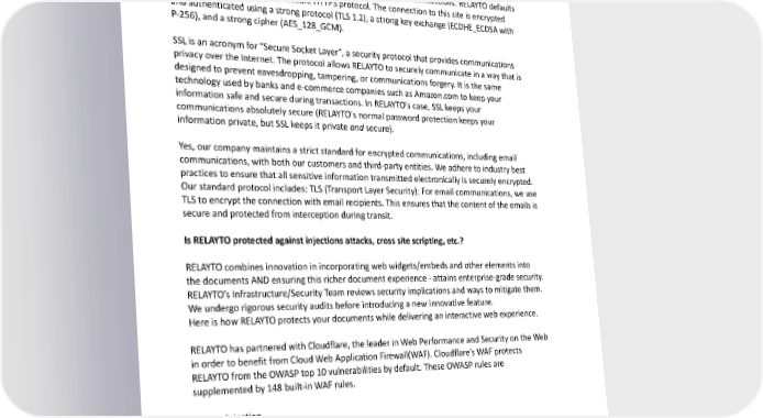 Is the connection to RELAYTO encrypted? Everyone with a RELAYTO account has encryption on all RELAYTO connections. RELAYTO defaults and redirects all traffic to the secure HTTPS protocol. The connection to this site is encrypted and authenticated using a strong protocol (TLS 1.2), a strong key exchange (ECDHE_ECDSA with P-256), and a strong cipher (AES_128_GCM). SSL is an acronym for “Secure Socket Layer”, a security protocol that provides communications privacy over the Internet. The protocol allows RELAYTO to securely communicate in a way that is designed to prevent eavesdropping, tampering, or communications forgery. It is the same technology used by banks and e-commerce companies such as Amazon.com to keep your information safe and secure during transactions. In RELAYTO's case, SSL keeps your communications absolutely secure (RELAYTO's normal password protection keeps your information private, but SSL keeps it private and secure). Yes, our company maintains a strict standard for encrypted communications, including email communications, with both our customers and third-party entities. We adhere to industry best practices to ensure that all sensitive information transmitted electronically is securely encrypted. Our standard protocol includes: TLS (Transport Layer Security): For email communications, we use TLS to encrypt the connection with email recipients. This ensures that the content of the emails is secure and protected from interception during transit. Is RELAYTO protected against injections attacks, cross site scripting, etc.? RELAYTO combines innovation in incorporating web widgets/embeds and other elements into the documents AND ensuring this richer document experience - attains enterprise-grade security. RELAYTO’s Infrastructure/Security Team reviews security implications and ways to mitigate them. We undergo rigorous security audits before introducing a new innovative feature. Here is how RELAYTO protects your documents while delivering an interactive web experience. RELAYTO has partnered with Cloudflare, the leader in Web Performance and Security on the Web in order to benefit from Cloud Web Application Firewall(WAF). Cloudflare’s WAF protects RELAYTO from the OWASP top 10 vulnerabilities by default. These OWASP rules are supplemented by 148 built-in WAF rules. - Injection - Broken authentication and session management - Cross-site scripting (XSS) - Insecure direct object references - Security misconfiguration - Sensitive data exposure - Missing function-level access control 45 of 53