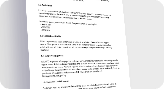 SLA SERVICE LEVEL AGREEMENT RELAYTO will use commercially reasonable efforts to maximize the availability of its services, and provides performance guarantees as detailed below. 1.1. Availability RELAYTO guarantees 99.9% availability of RELAYTO systems utilized to provide services during any calendar month. If RELAYTO fails to meet its availability guarantee, RELAYTO will credit customer's account with an amount according to the table below: Availability during a contracted month Compensation (% of monthly fee)
