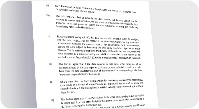 (f) The data importer agrees that the choice made by the data subject will not prejudice his/her substantive and procedural rights to seek remedies in accordance with applicable laws. Clause 12 Liability (a) Each Party shall be liable to the other Party/ies for any damages it causes the other Party/ies by any breach of these Clauses. (b) The data importer shall be liable to the data subject, and the data subject shall be entitled to receive compensation, for any material or non-material damages the data importer or its sub-processor causes the data subject by breaching the third-party beneficiary rights under these Clauses. (c) Notwithstanding paragraph (b), the data exporter shall be liable to the data subject, and the data subject shall be entitled to receive compensation, for any material or non-material damages the data exporter or the data importer (or its sub-processor) causes the data subject by breaching the third-party beneficiary rights under these Clauses. This is without prejudice to the liability of the data exporter and, where the data exporter is a processor acting on behalf of a controller, to the liability of the controller under Regulation (EU) 2016/679 or Regulation (EU) 2018/1725, as applicable. (d) The Parties agree that if the data exporter is held liable under paragraph (c) for damages caused by the data importer (or its sub-processor), it shall be entitled to claim back from the data importer that part of the compensation corresponding to the data importer’s responsibility for the damage. (e) Where more than one Party is responsible for any damage caused to the data subject as a result of a breach of these Clauses, all responsible Parties shall be jointly and severally liable and the data subject is entitled to bring an action in court against any of these Parties. (f) The Parties agree that if one Party is held liable under paragraph (e), it shall be entitled to claim back from the other Party/ies that part of the compensation corresponding to its / their responsibility for the damage. (g) The data importer may not invoke the conduct of a sub-processor to avoid its own liability. Clause 13 Supervision 30 of 53