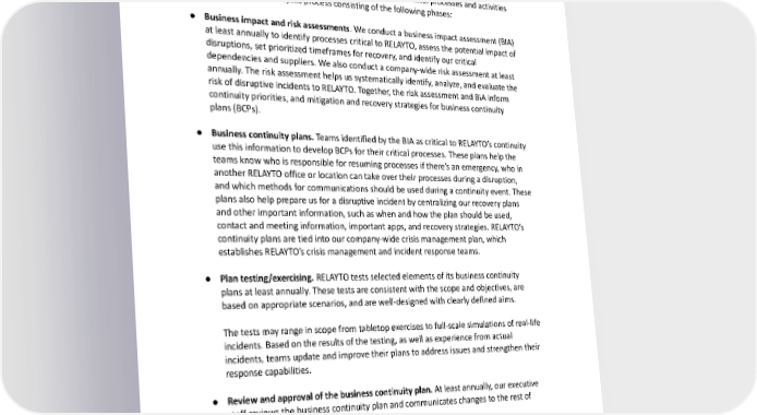 Do you have a business continuity plan? RELAYTO has a business continuity plan to address how to resume or continue providing services to users—as well as how to function as a company—if business-critical processes and activities are disrupted. We conduct a cyclic process consisting of the following phases: ● Business impact and risk assessments. We conduct a business impact assessment (BIA) at least annually to identify processes critical to RELAYTO, assess the potential impact of disruptions, set prioritized timeframes for recovery, and identify our critical dependencies and suppliers. We also conduct a company-wide risk assessment at least annually. The risk assessment helps us systematically identify, analyze, and evaluate the risk of disruptive incidents to RELAYTO. Together, the risk assessment and BIA inform continuity priorities, and mitigation and recovery strategies for business continuity plans (BCPs). ● Business continuity plans. Teams identified by the BIA as critical to RELAYTO’s continuity use this information to develop BCPs for their critical processes. These plans help the teams know who is responsible for resuming processes if there’s an emergency, who in another RELAYTO office or location can take over their processes during a disruption, and which methods for communications should be used during a continuity event. These plans also help prepare us for a disruptive incident by centralizing our recovery plans and other important information, such as when and how the plan should be used, contact and meeting information, important apps, and recovery strategies. RELAYTO’s continuity plans are tied into our company-wide crisis management plan, which establishes RELAYTO’s crisis management and incident response teams. ● Plan testing/exercising. RELAYTO tests selected elements of its business continuity plans at least annually. These tests are consistent with the scope and objectives, are based on appropriate scenarios, and are well-designed with clearly defined aims. The tests may range in scope from tabletop exercises to full-scale simulations of real-life incidents. Based on the results of the testing, as well as experience from actual incidents, teams update and improve their plans to address issues and strengthen their response capabilities. ● Review and approval of the business continuity plan. At least annually, our executive staff reviews the business continuity plan and communicates changes to the rest of the team. Do you have a disaster recovery plan? To address information security requirements during a major crisis or disaster impacting RELAYTO operations, we maintain a disaster recovery plan. The RELAYTO Infrastructure/Security 43 of 53