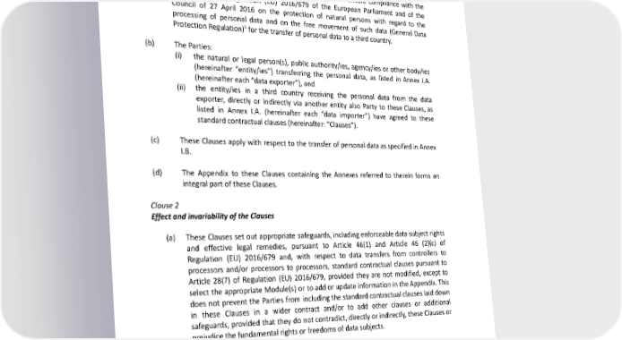 Clause 1 Purpose and scope (a) The purpose of these standard contractual clauses is to ensure compliance with the requirements of Regulation (EU) 2016/679 of the European Parliament and of the Council of 27 April 2016 on the protection of natural persons with regard to the processing of personal data and on the free movement of such data (General Data Protection Regulation)1 for the transfer of personal data to a third country. (b) The Parties: (i) the natural or legal person(s), public authority/ies, agency/ies or other body/ies (hereinafter “entity/ies”) transferring the personal data, as listed in Annex I.A. (hereinafter each “data exporter”), and (ii) the entity/ies in a third country receiving the personal data from the data exporter, directly or indirectly via another entity also Party to these Clauses, as listed in Annex I.A. (hereinafter each “data importer”) have agreed to these standard contractual clauses (hereinafter: “Clauses”). (c) These Clauses apply with respect to the transfer of personal data as specified in Annex I.B. (d) The Appendix to these Clauses containing the Annexes referred to therein forms an integral part of these Clauses. Clause 2 Effect and invariability of the Clauses (a) These Clauses set out appropriate safeguards, including enforceable data subject rights and effective legal remedies, pursuant to Article 46(1) and Article 46 (2)(c) of Regulation (EU) 2016/679 and, with respect to data transfers from controllers to processors and/or processors to processors, standard contractual clauses pursuant to Article 28(7) of Regulation (EU) 2016/679, provided they are not modified, except to select the appropriate Module(s) or to add or update information in the Appendix. This does not prevent the Parties from including the standard contractual clauses laid down in these Clauses in a wider contract and/or to add other clauses or additional safeguards, provided that they do not contradict, directly or indirectly, these Clauses or prejudice the fundamental rights or freedoms of data subjects. (b) These Clauses are without prejudice to obligations to which the data exporter is subject by virtue of Regulation (EU) 2016/679. Clause 3 Third-party beneficiaries 22 of 53